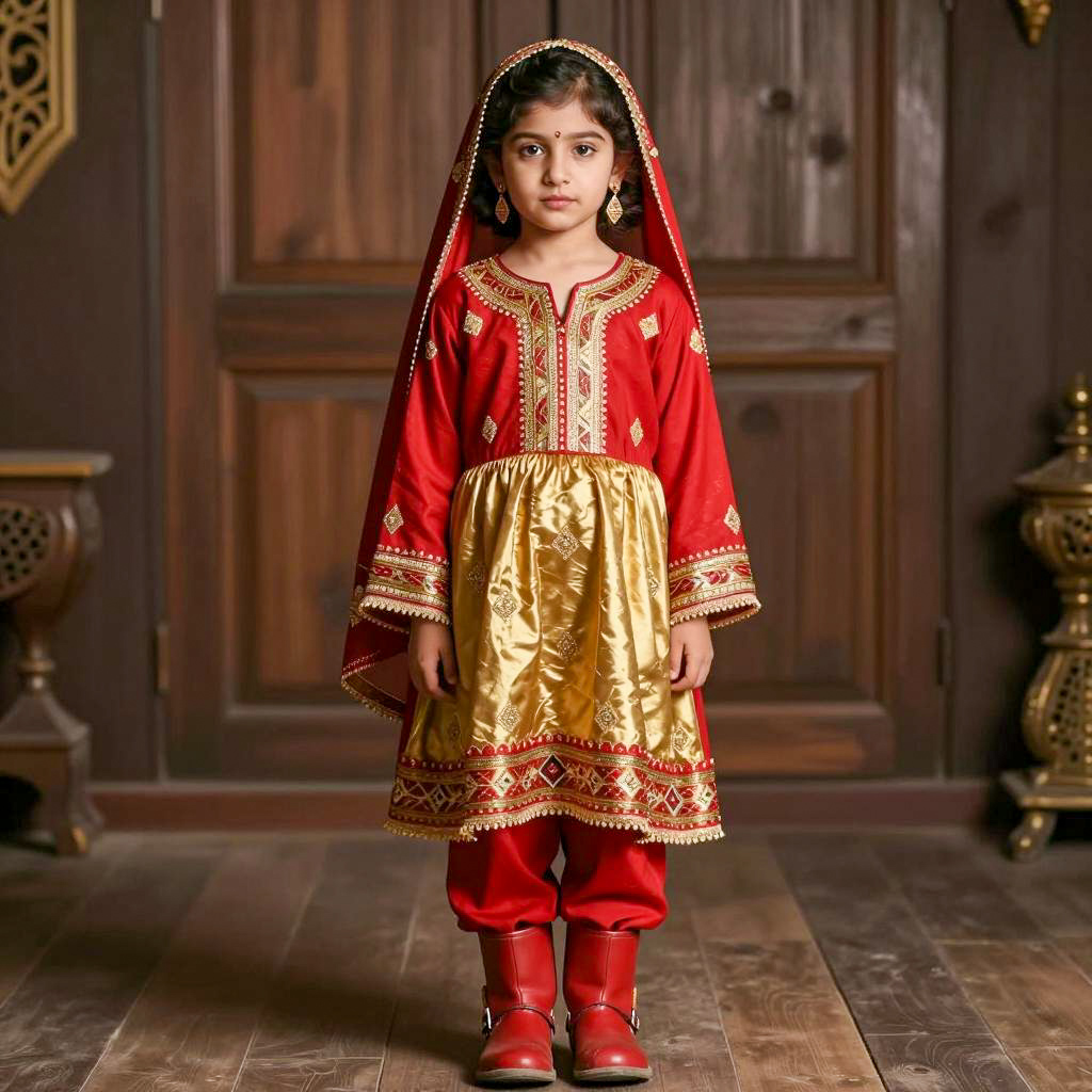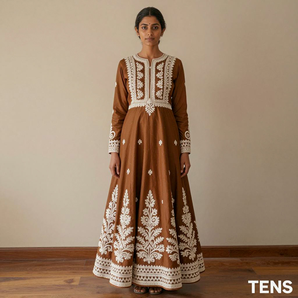 Vintage wedding gowns, photograph of Indian woman, standing, full body, facing camera, brown vintage-style dress with intricate white embroidery, puffed long sleeves, high neckline, dark hair in a simple bun, subtle makeup, neutral expression, indoor setting, beige wall, soft natural light, wooden floor, elegant and traditional, in bottom right corner, "TEENS"