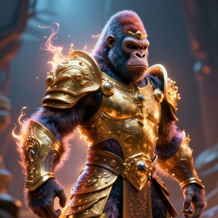 A digital CGI image depicting a muscular, anthropomorphic gorilla warrior in ornate, golden armor. The armor is intricately designed with flame-like effects emanating from the shoulders and arms, highlighting its metallic texture. The gorilla's fur is dark and dense, with a determined expression on its face. The background is a blurred, dark, and mystical setting with blue and orange lighting, suggesting a fantasy environment. The gorilla stands in a powerful, heroic pose, with one arm slightly raised and the other by its side. The overall style is highly detailed and vibrant, emphasizing the character's strength and commanding presence.