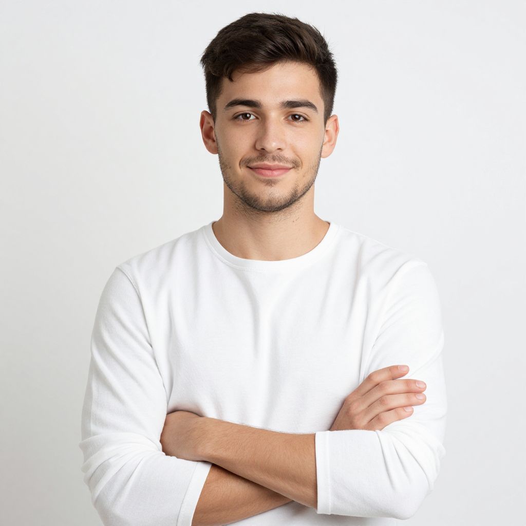 This is a photograph of a young man with short, dark brown hair and light stubble. He has a fair skin tone and is wearing a plain white, long-sleeved shirt. He stands facing the camera with a slight, relaxed smile and his arms crossed over his chest. The background is a plain white, making him the clear focal point of the image.