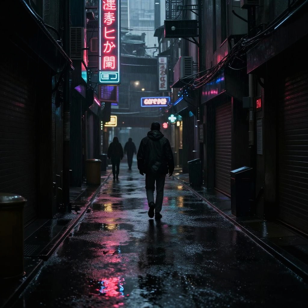 Foreboding dark alleyway in a dystopian cyberpunk cityscape, neon signs flickering amid thick rain, shadowy figures lurking in the background, reflective wet surfaces and stark contrasts between light and darkness, capturing tension and uncertainty in a futuristic urban environment.