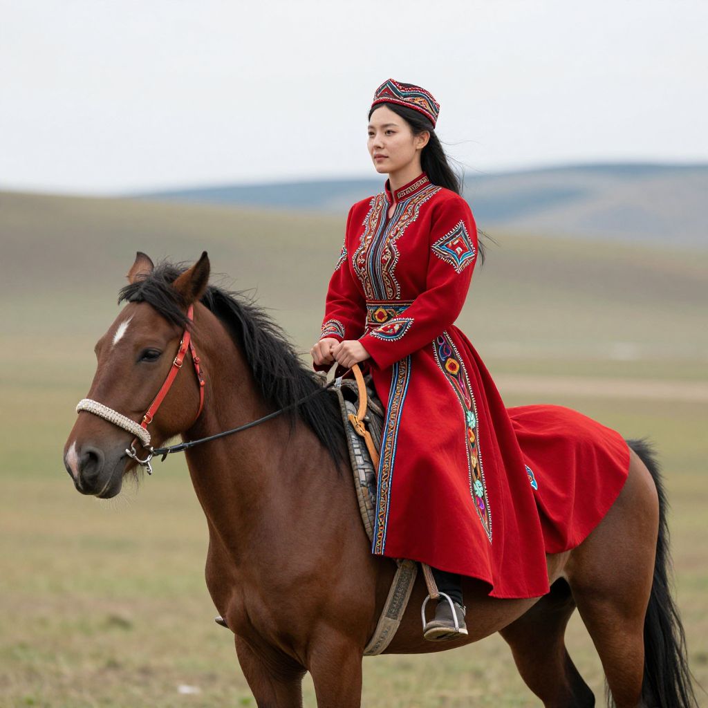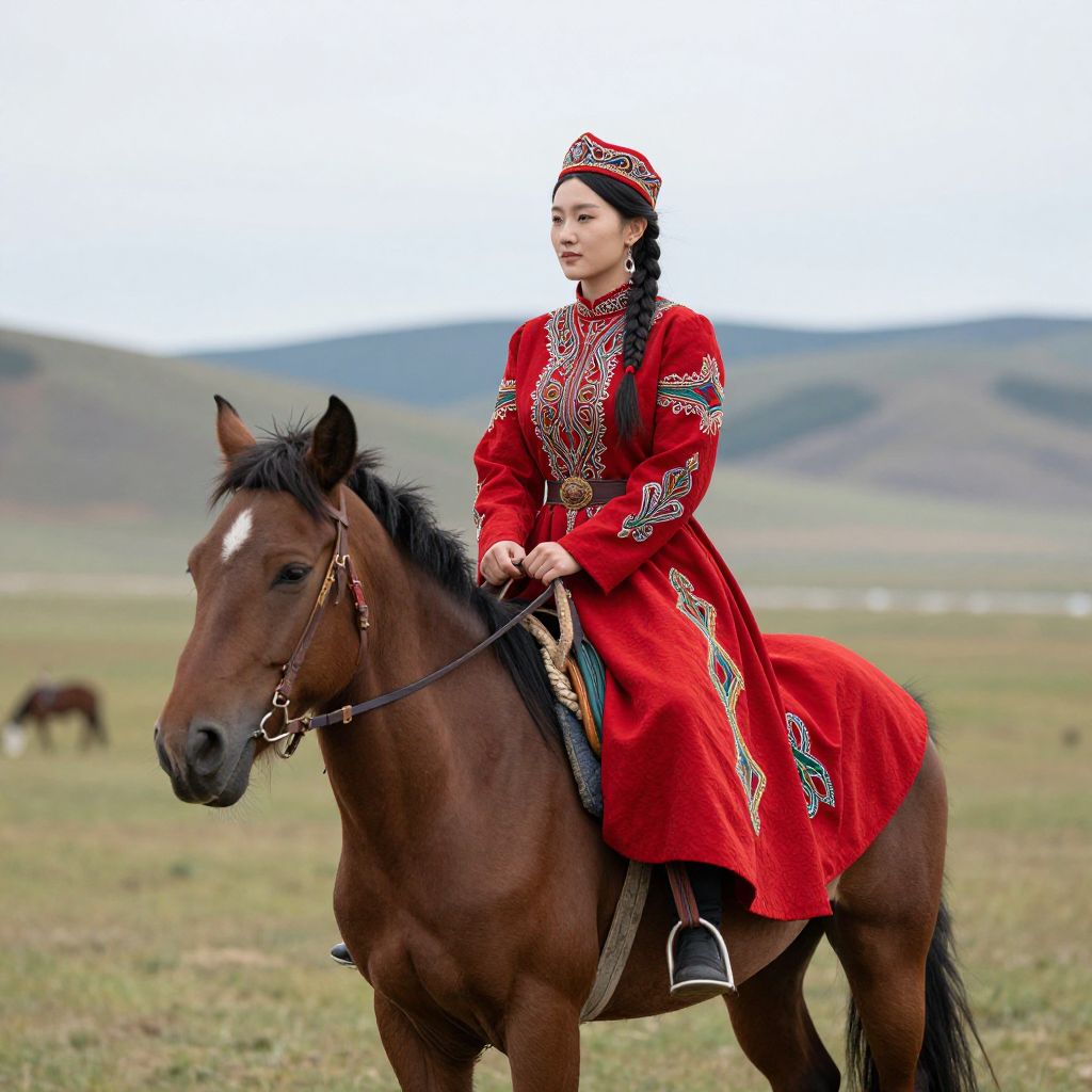 Woman riding a brown horse in a vibrant Tuvan national costume, featuring intricate embroidery and bold red hues, symbolizing the nomadic lifestyle against a backdrop of open grasslands and distant hills.