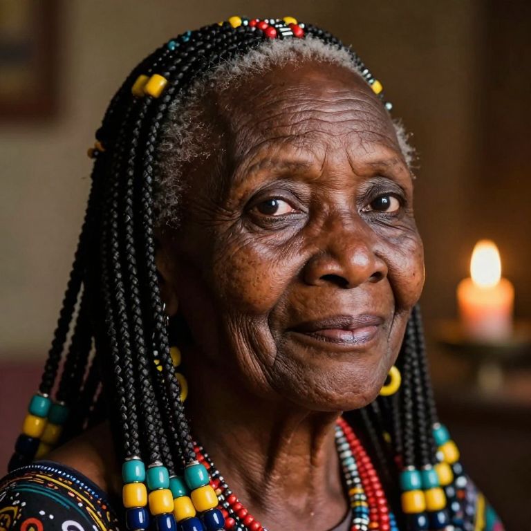 Photograph of an elderly African woman with dark skin, braided hair adorned with colorful beads, wearing a patterned top, smiling softly, candlelit