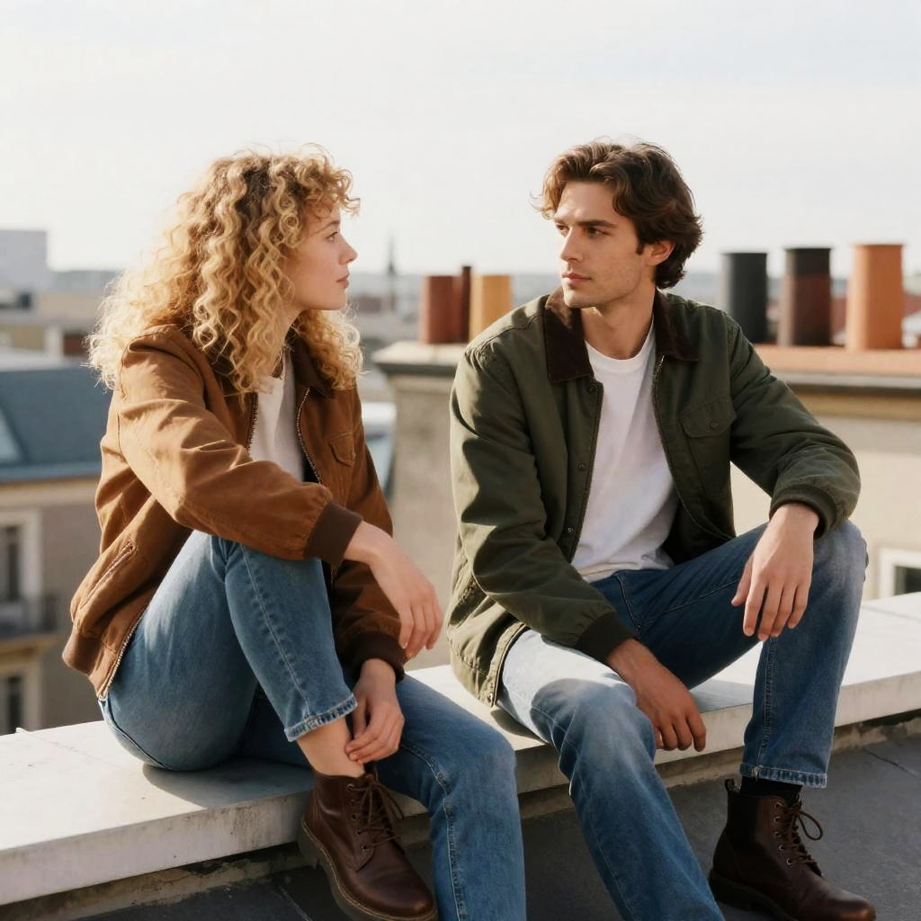 Photograph of a man and woman sitting on a rooftop ledge. Woman with curly blonde hair in brown jacket and jeans, looking at man. Man with straight brown hair in green jacket and blue jeans, looking away. Cityscape background with buildings and chimneys. Both seated with legs crossed, hands on knees. Bright daylight.