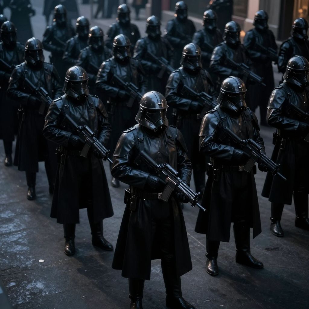 ((master.piece)) best quality, ultra-detailed, best shadow, cinematic light, hyper detail. soldiers wearing black leathercoats holding futuristic weapons. soldiers in an "Imperial March" formation. conquering parade. Wearing only "Black Uniform". dramatic photography. upper view from the back.