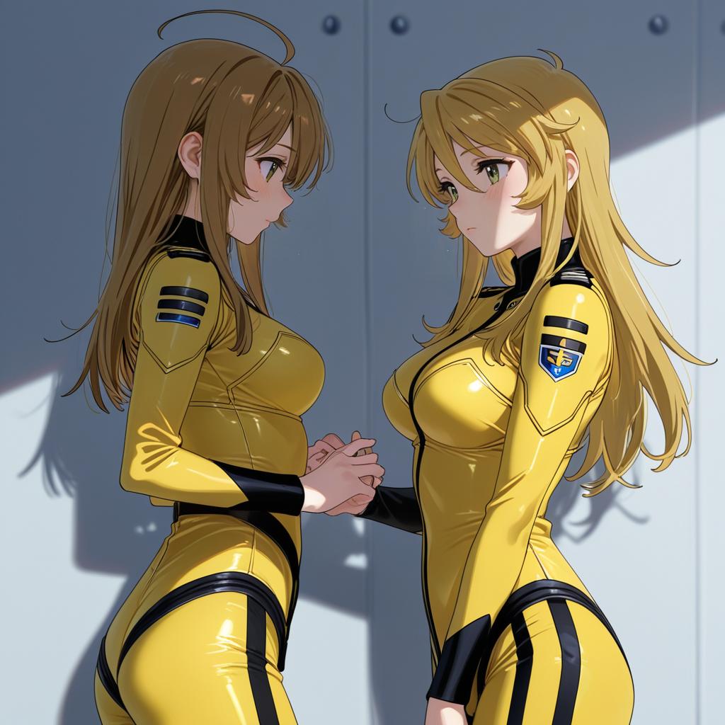 Digital illustration of two anime-style girls facing each other and holding hands. Both characters have long hair, one with brown hair and brown eyes, the other with blonde hair and purple eyes. They are dressed in tight yellow bodysuits with black accents and patches on the shoulders, standing against a plain background with soft shadows.