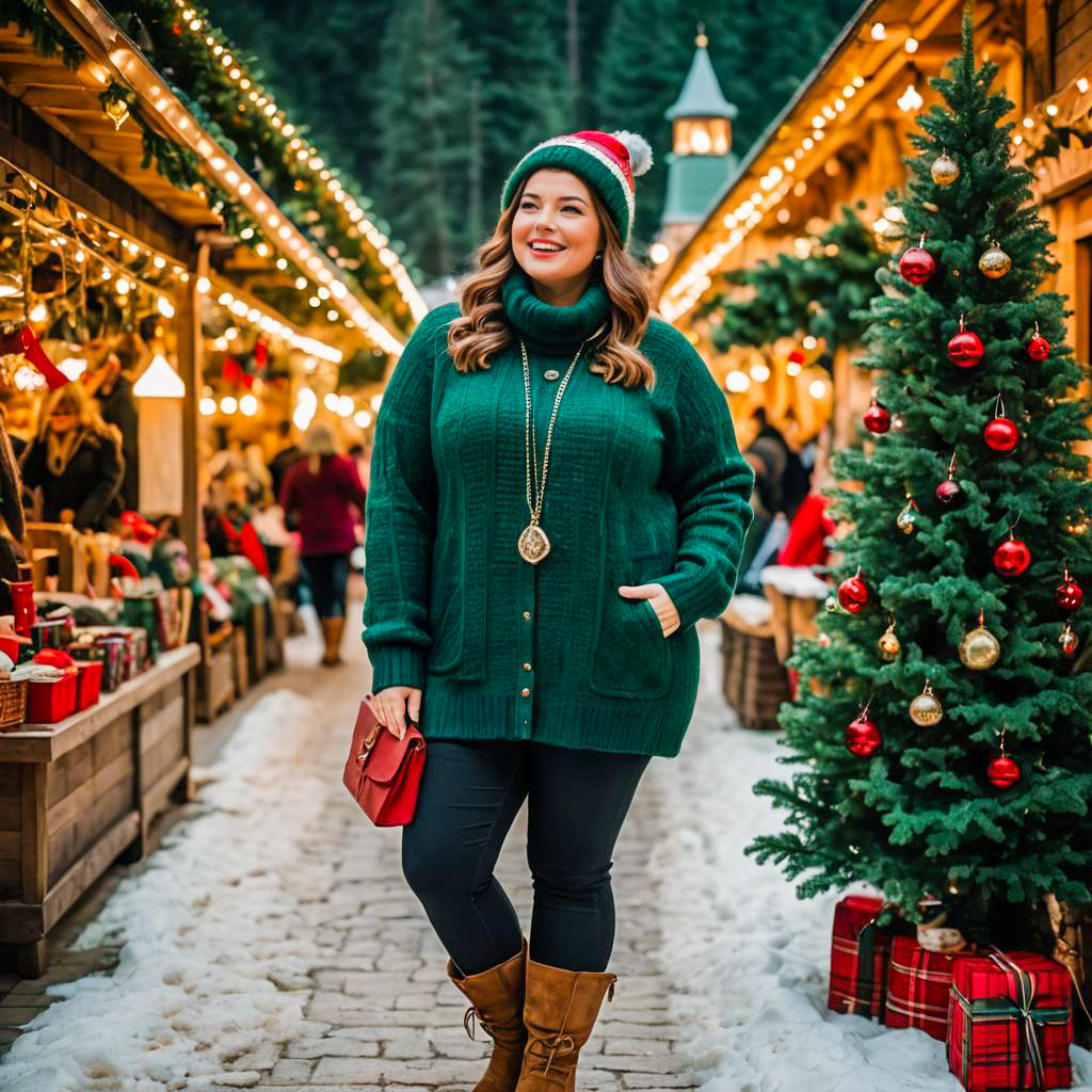 Photo of a Curvy woman, Long Layers, Christmas outfit, cozy Forest Green sweater made of Wool, plaid patterns, winter boots, Santa hat, holiday accessories, outdoor Christmas market, festival-inspired look