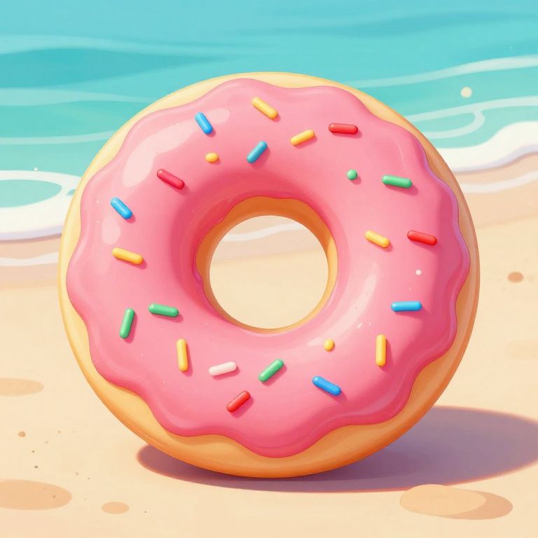 A vibrant digital illustration features a pink jelly-style donut adorned with colorful sprinkles, set against a serene beach backdrop with turquoise waves and sandy shores, capturing a playful and summery aesthetic.