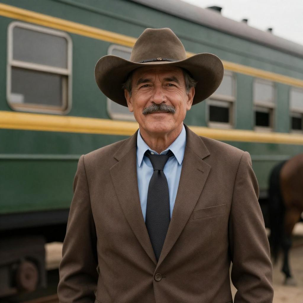 Photograph of a middle-aged man with a brown cowboy hat, mustache, and brown suit, smiling slightly. He wears a light blue shirt and dark tie. Behind him is a vintage green train with yellow trim. Horses are partially visible to the right. The man stands in front of the train, which is parked outdoors.