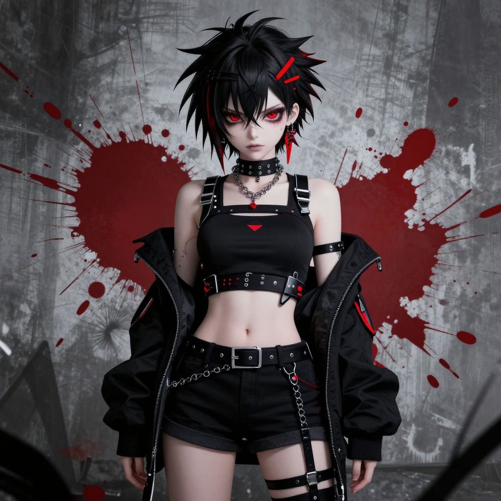 An anime woman with spiky hair and red eyes, dressed in punk-style cyber goth attire, stands against a grungy, splatter background.