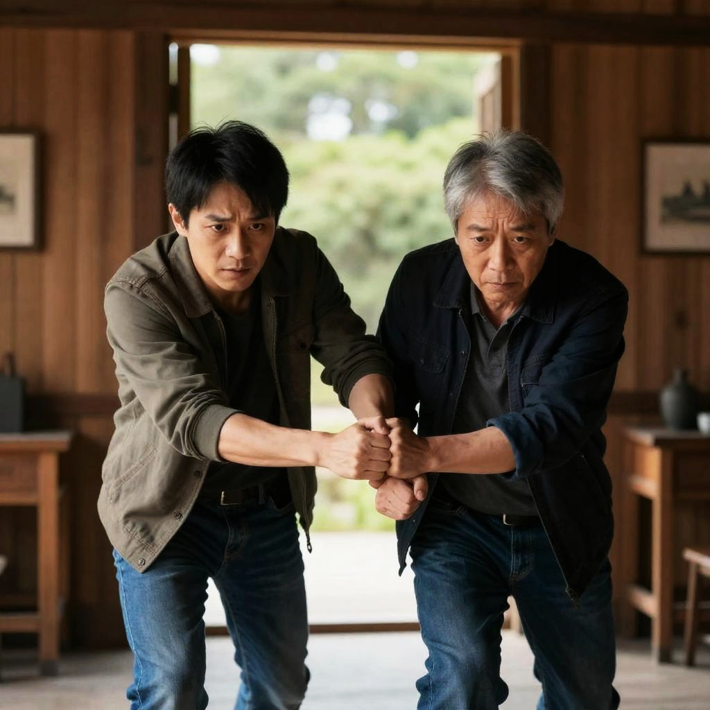 Photograph of two men standing close together outdoors. The man on the right has dark hair, wears a gray blazer, blue shirt, and blue-striped tie, with a can of "Tang" in his right hand. The man on the left has dark hair, wears a brown jacket, and leans into the man on the right, smiling. Background includes a brick wall and a white truck. Both men have relaxed, friendly facial expressions.