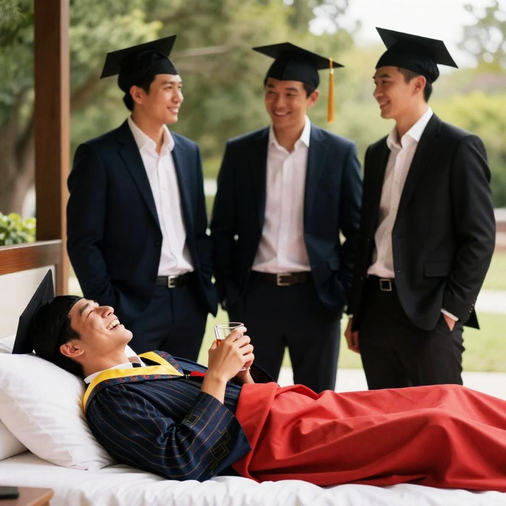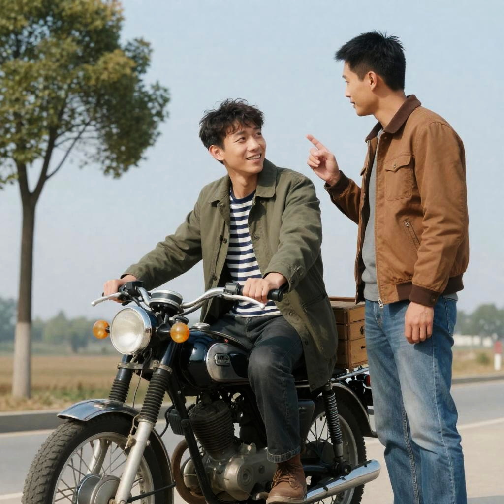 Photograph of two men in green work uniforms, standing indoors. One man smiles and leans against a metal structure, holding a saddle. The other man, with short black hair, holds the saddle's reins. Background includes a window and wooden furniture. Both men have medium builds and are facing each other. Bright, warm lighting.