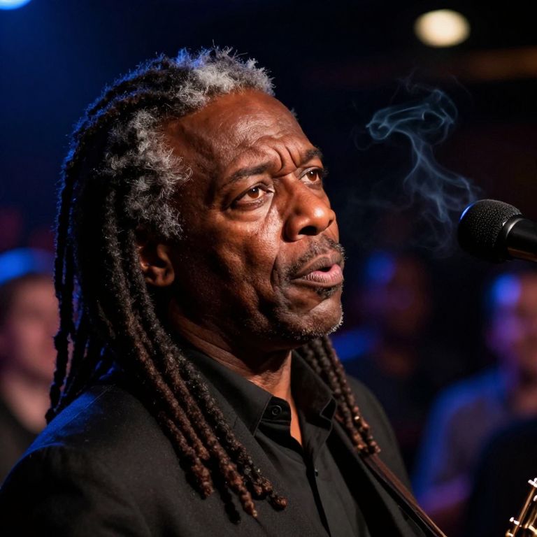 Craft an ultra-realistic portrait of an African-American jazz musician with warm brown eyes and salt-and-pepper dreadlocks. Capture him from a unique 'above-the-shoulder' perspective as he stands amidst the dimly lit ambiance of a smoky blues nightclub. His expression exudes passion and intensity, reflecting on a lifetime of sharing melodies that resonate deep within the soul. Soft ambient light from a stage spotlight illuminates his face, highlighting intricate skin textures and a determined furrow in his brow. As he navigates the emotional depth of his music, an intense connection between artist and audience is evoked.