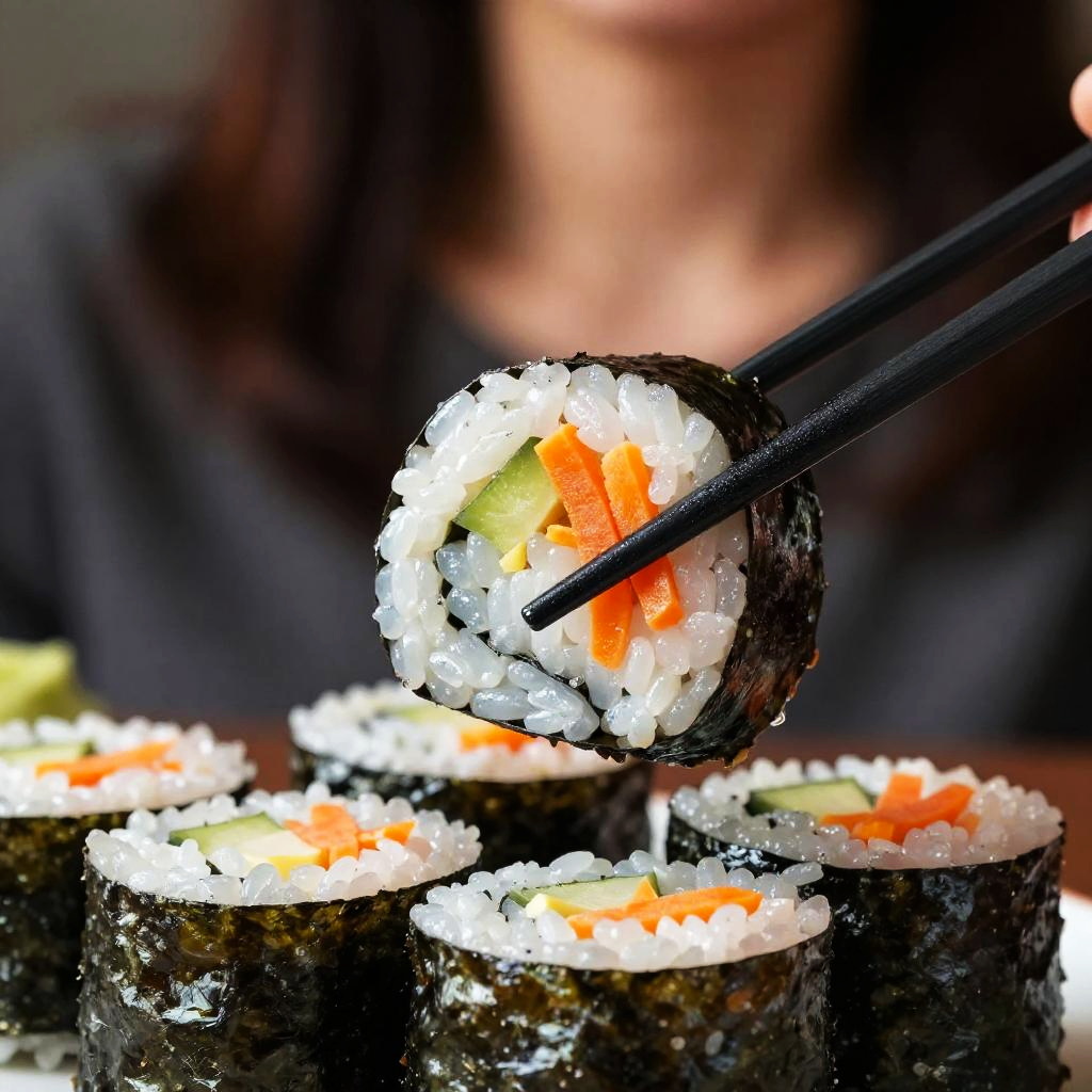 A close-up photo of sushi rolls with black seaweed wraps, white rice, and orange carrot strips. A person with brown hair holds a pair of black chopsticks, lifting one sushi roll. The background is blurred, focusing on the sushi. The image has a slightly glossy, high-contrast style, highlighting the textures of the seaweed and rice.