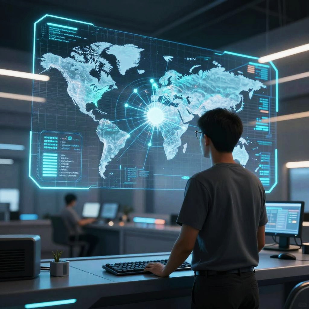Regional prompter stable diffusion concept art, futuristic control center with holographic maps and interconnected nodes, glowing neon lights, high-tech ambiance, digital art style