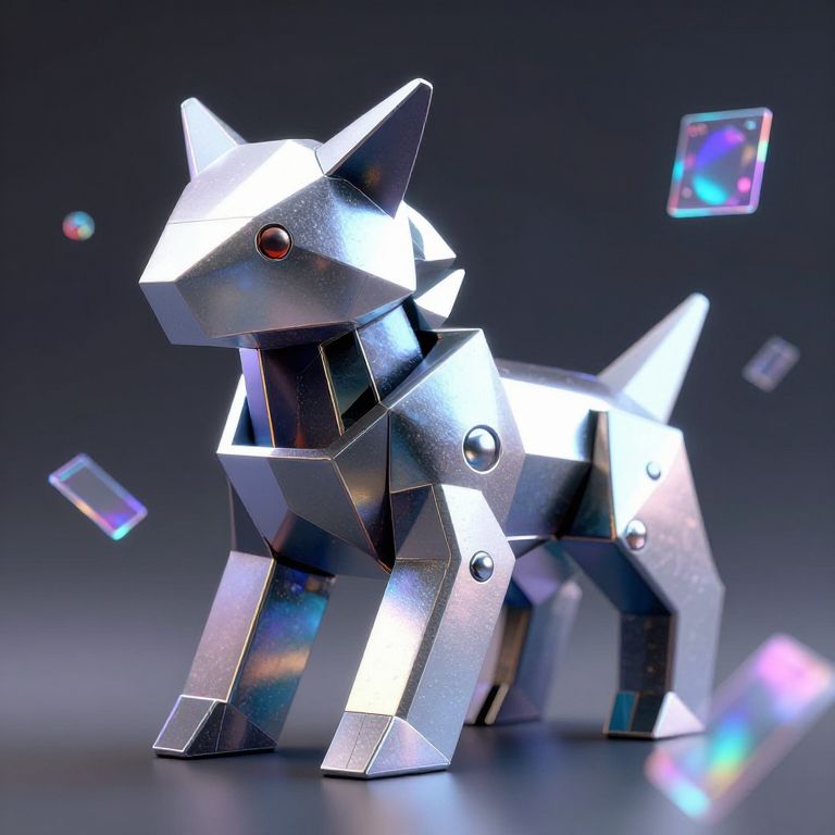Photorealistic CGI of a silver, angular, metallic paper-folded cat with red eyes, surrounded by floating, iridescent, square crystals.