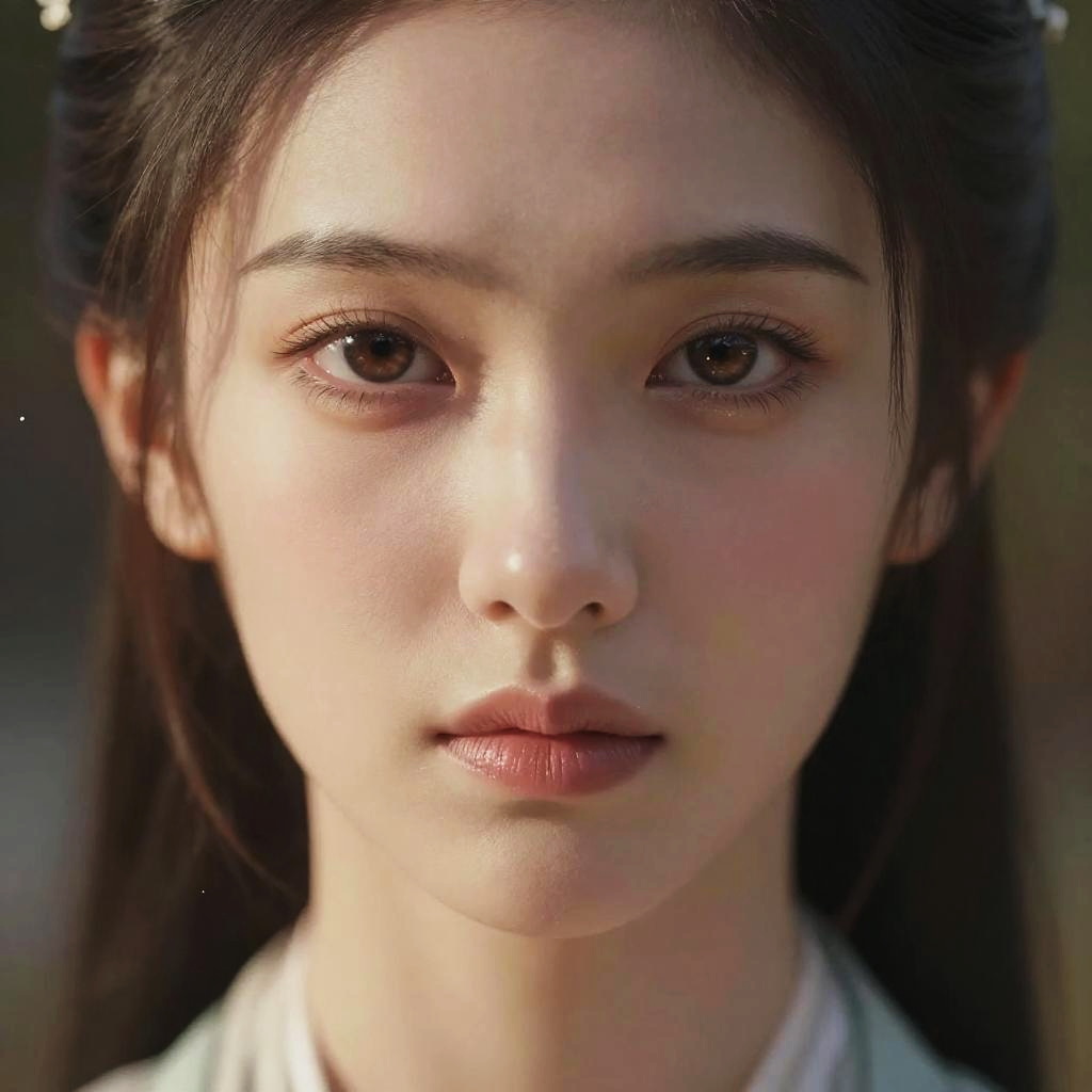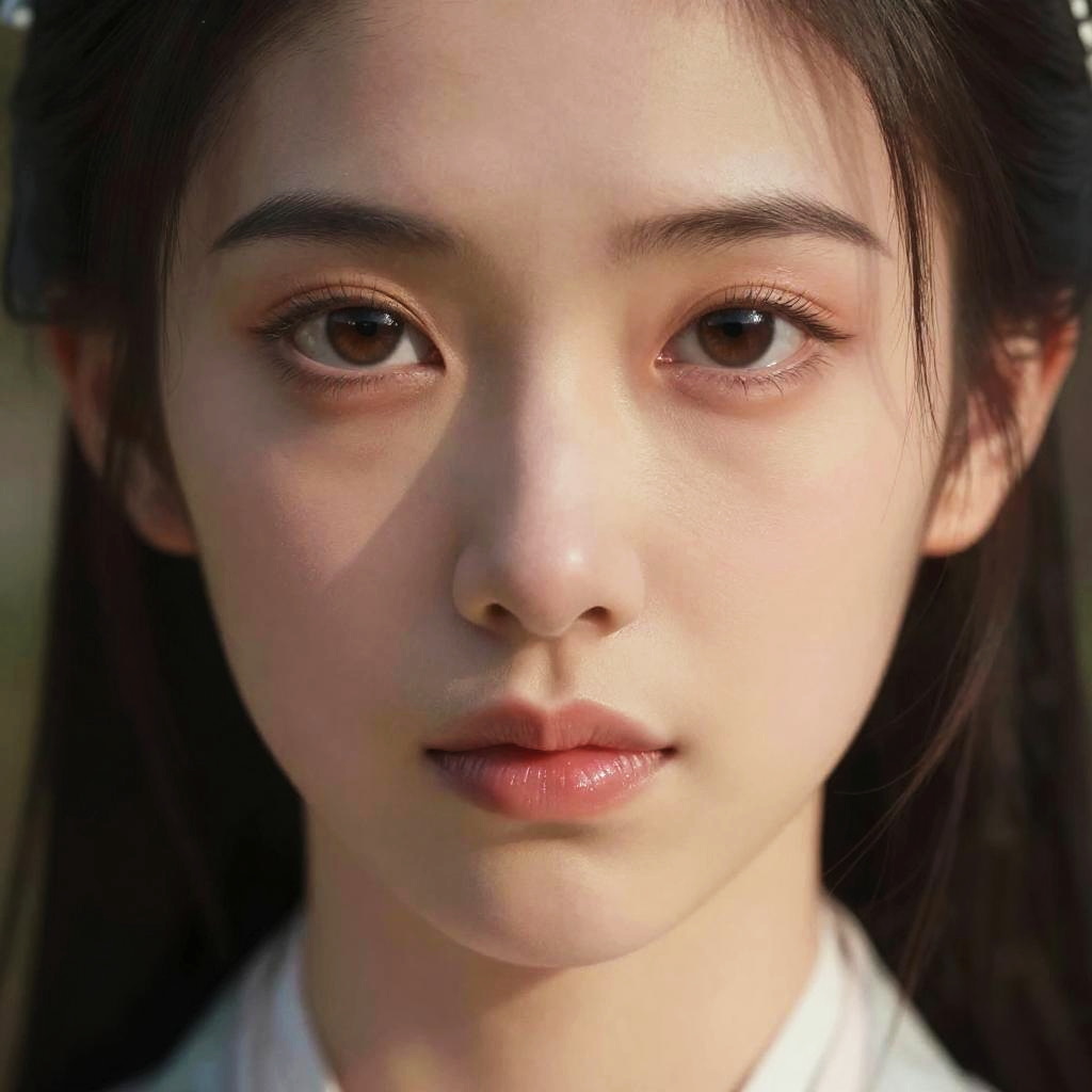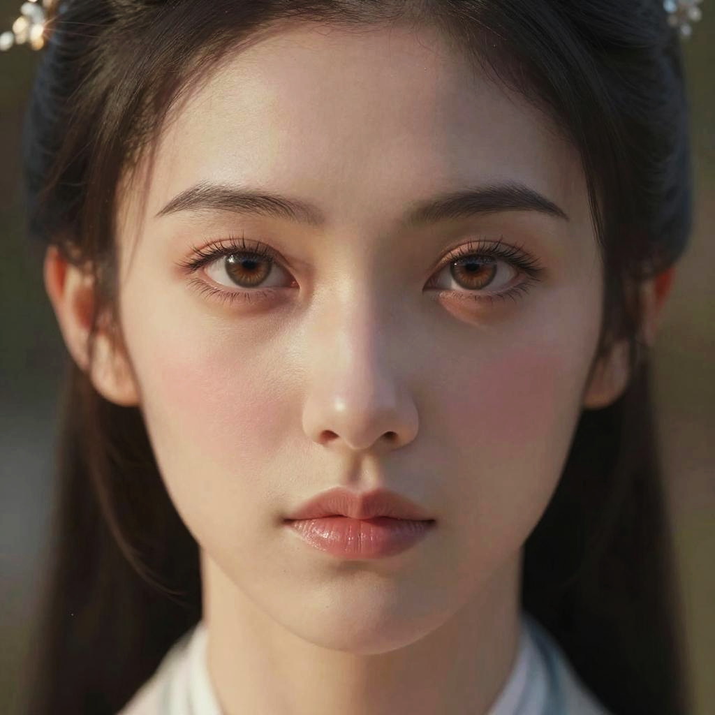 Photorealistic close-up portrait of a young Asian woman with fair skin, dark brown eyes, and straight black hair, wearing traditional white clothing, with