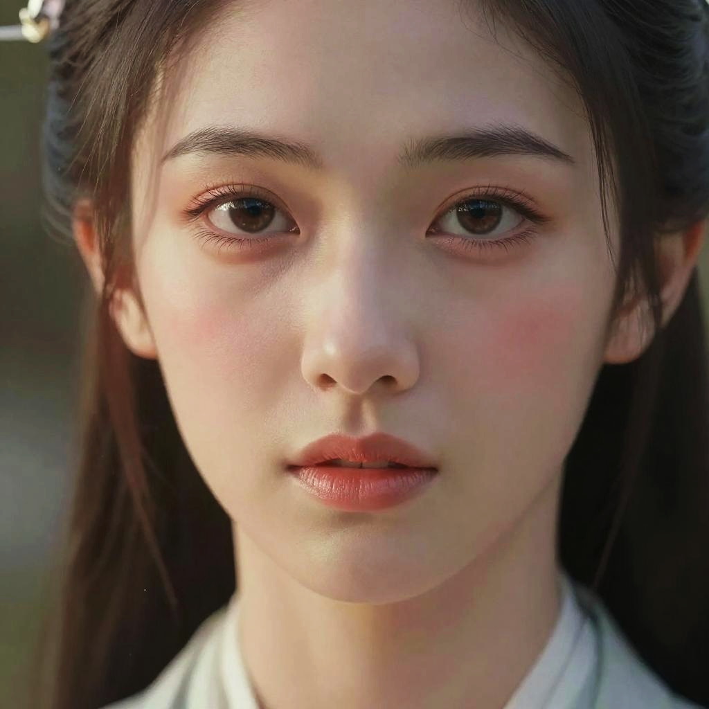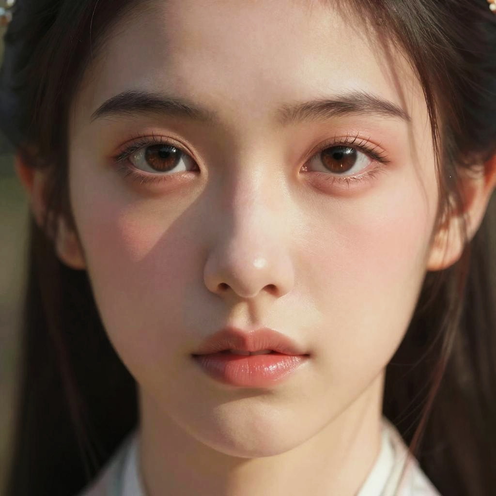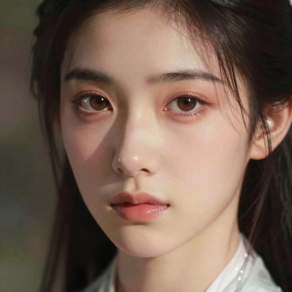 Photorealistic close-up portrait of a young Asian woman with fair skin, dark brown eyes, and straight black hair, wearing traditional white clothing, with