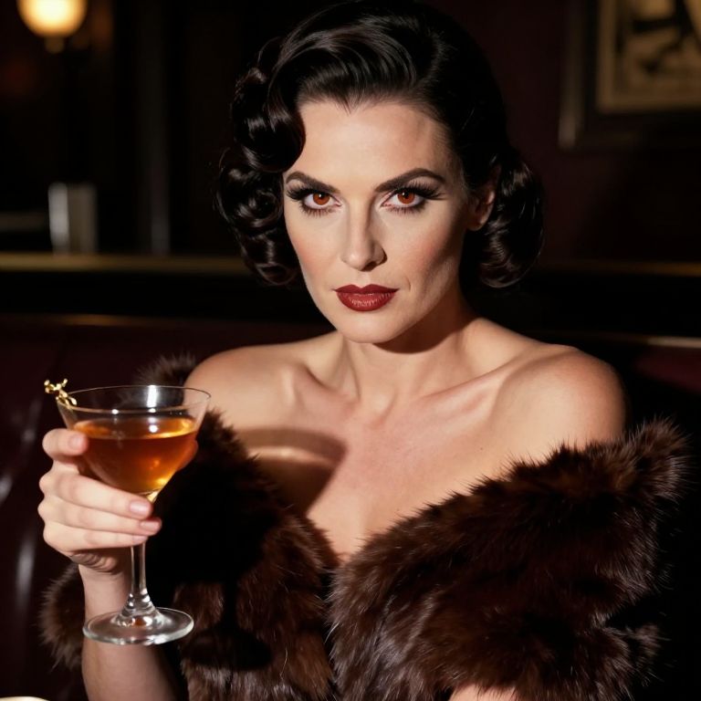 Glamorous photograph of a woman with dark, wavy hair, wearing a fur stole, holding a martini glass with amber liquid, in a