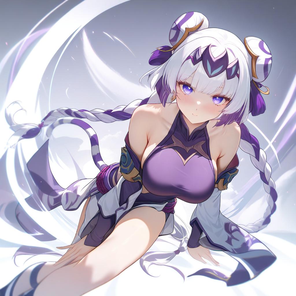 Haku (p&d), puzzle & dragons, 1girl, tiger tail, white hair, two-tone hair, long hair, purple hair, double bun, twin braids, medium breasts, bare shoulders, by artist solar (happymonk), animagine