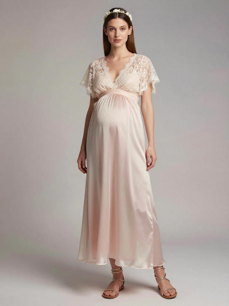 Portrait of a pregnant young woman wearing a powder blue A-line maternity dress with a statement collar and short puff sleeves. She stands calmly with her hands behind her back against a pastel lavender-to-pink ombré background. The woman has smooth straight brown hair tucked behind her ears and a neutral, composed expression. The soft, diffused studio lighting emphasizes the dress's sleek fabric and highlights the minimalist editorial fashion style.