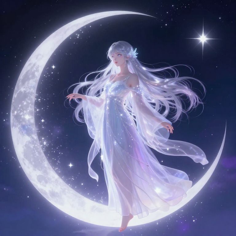 Anime girl moon goddess with flowing silver hair and glowing eyes, standing on a crescent moon surrounded by sparkling stars, ethereal light illuminating her delicate lunar robes, mystical aura, celestial background with deep blues and purples.