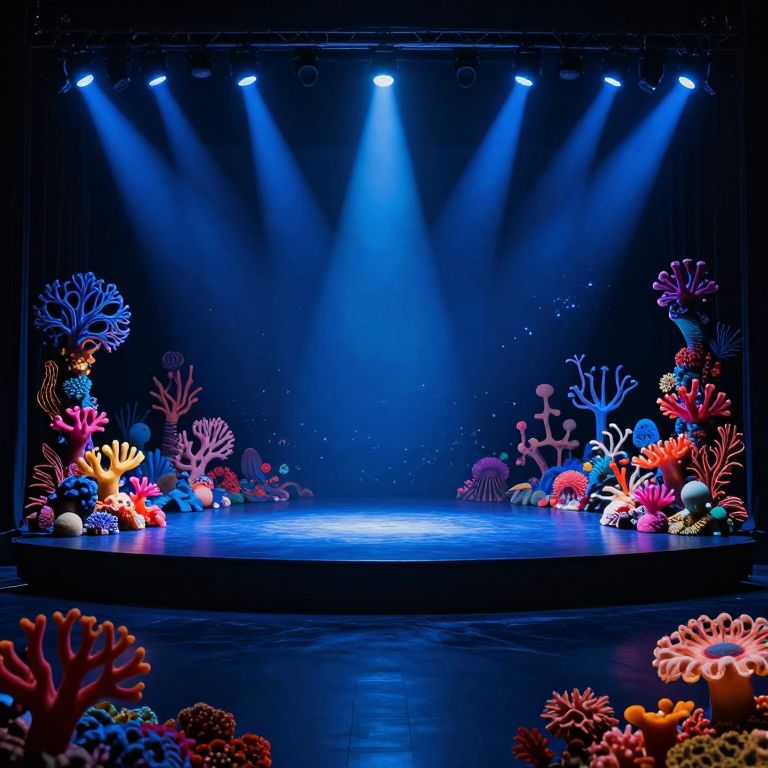 Vibrant underwater-themed stage set with colorful coral, sea anemones, and lights, illuminated by blue spotlights in a dark theater.