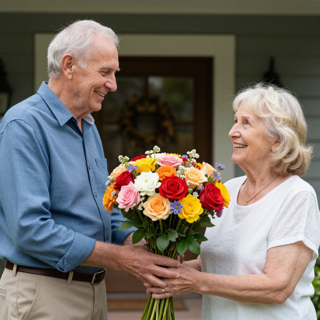 Two elderly individuals share a vibrant bouquet of colorful flowers, with the man presenting the arrangement to the woman who holds it joyfully, both smiling warmly in front of a cozy house backdrop.