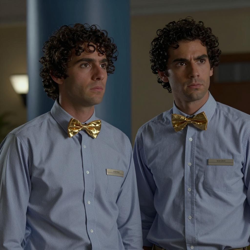 Two men dressed in blue 'Noisy Brothers' sports jerseys standing outdoors in front of a suburban yellow house with green shutters. Both men have curly dark hair and are smiling, representing a humorous, photorealistic portrayal inspired by the Step Brothers movie.