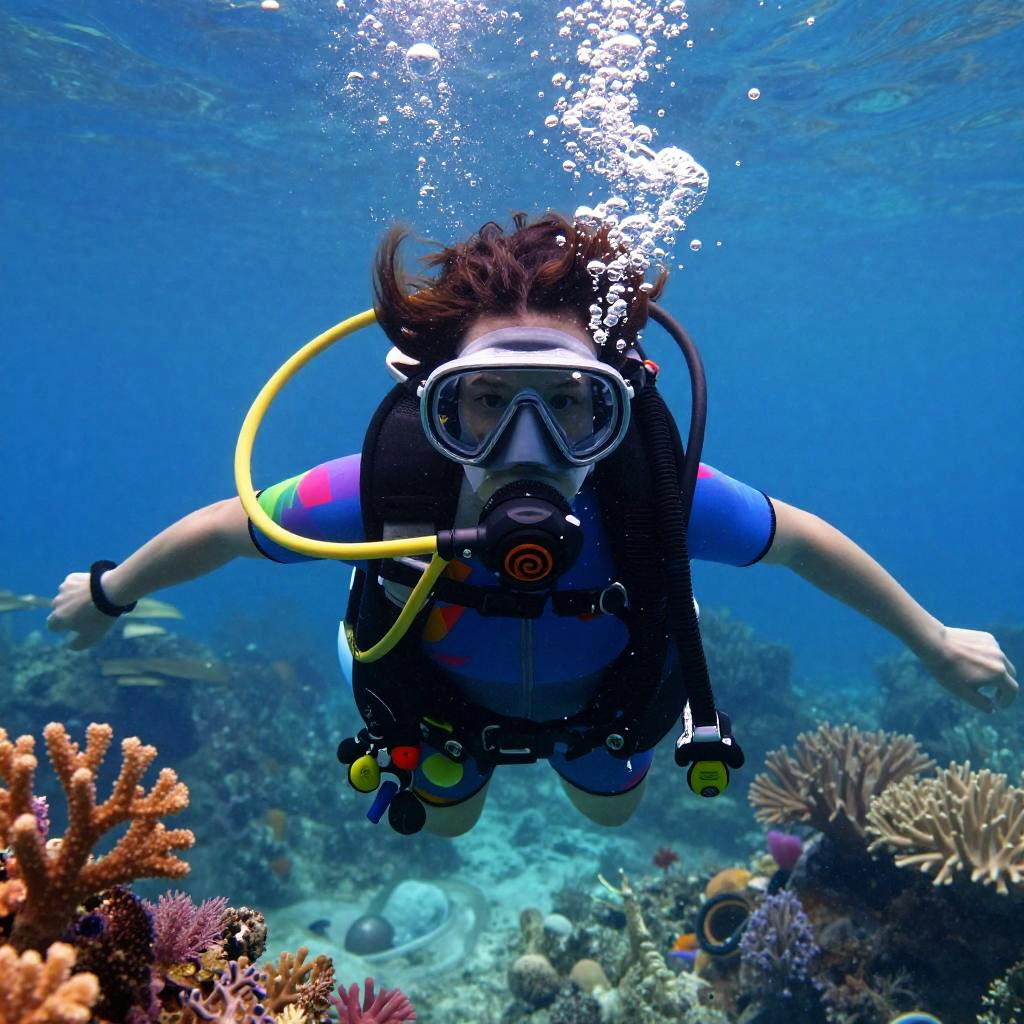 Anime girl underwater, intense gaze with bubbles rising, wearing scuba gear and colorful wetsuit, vibrant coral and marine life in background, cinematic and captivating composition