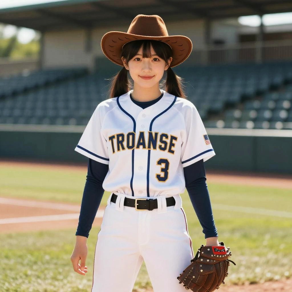 Young Asian female baseball player wearing a white Troanse baseball uniform with the number 3, paired with a navy long-sleeve undershirt and a brown cowboy hat. She is standing on a baseball field with an empty stadium background, holding a brown leather baseball glove, smiling directly at the camera. The image features natural daylight with a shallow depth of field and bokeh effect.