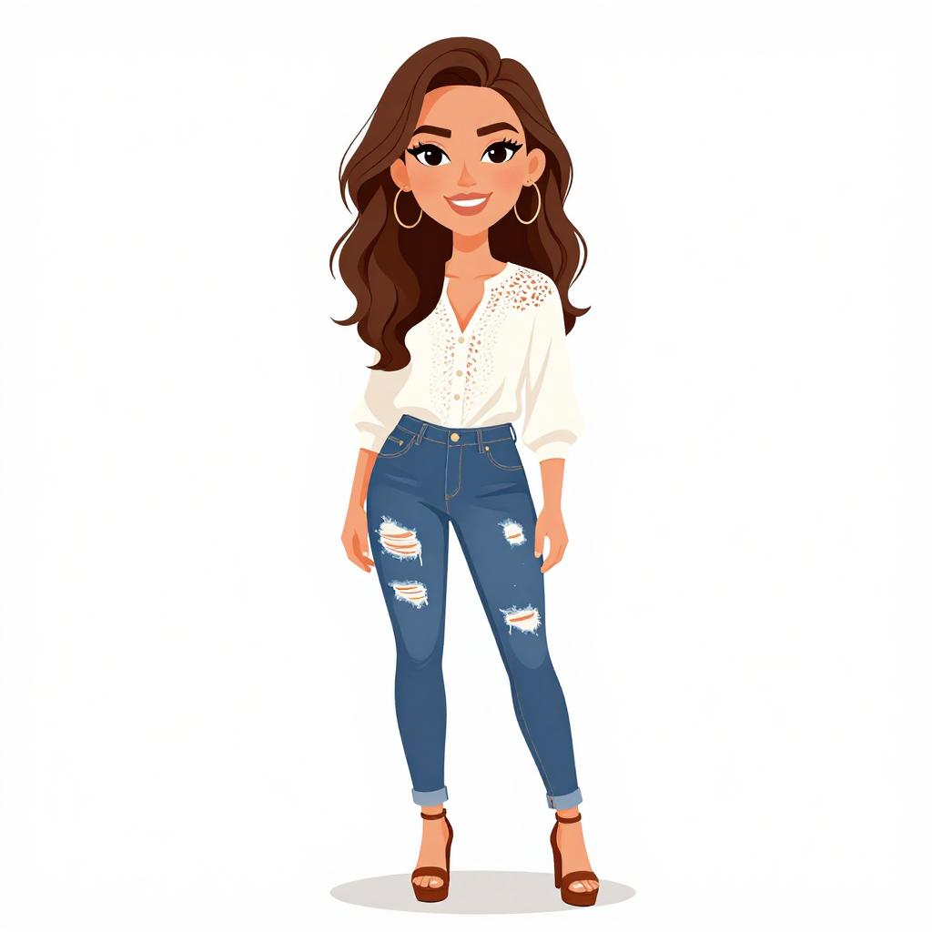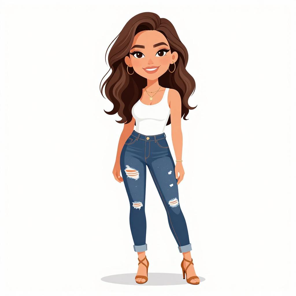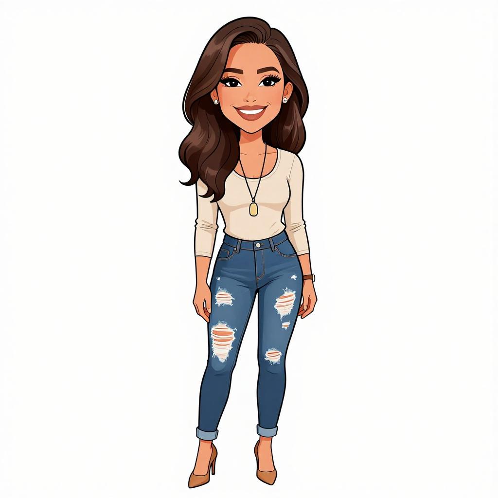 Illustration of a smiling woman with long wavy brown hair wearing a fitted black crew-neck t-shirt and distressed light blue skinny jeans with knee rips. She accessorizes with large hoop earrings, animal print pointed-toe high heels, and carries a fringed black leather handbag. The style is casual and fashionable.