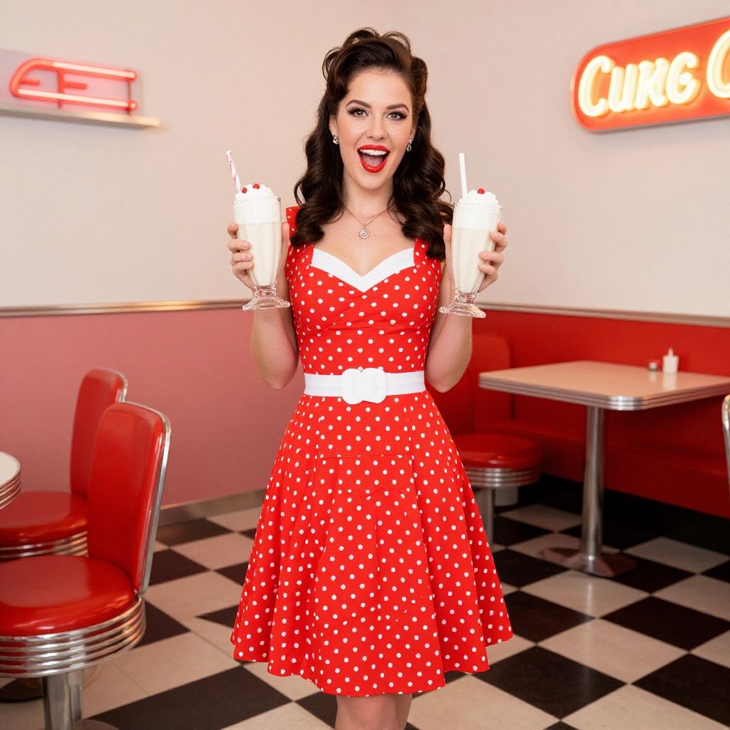 A cheerful woman dressed in a red polka dot vintage dress poses inside a retro 1950s diner while holding two milkshakes. The classic diner interior features red stools, a checkered floor, and nostalgic signage, creating an authentic vintage Americana atmosphere.