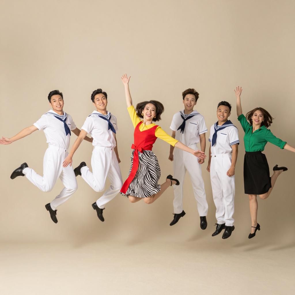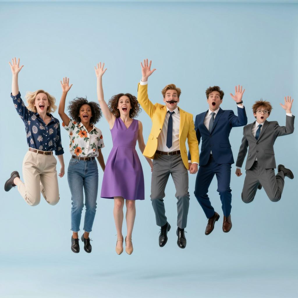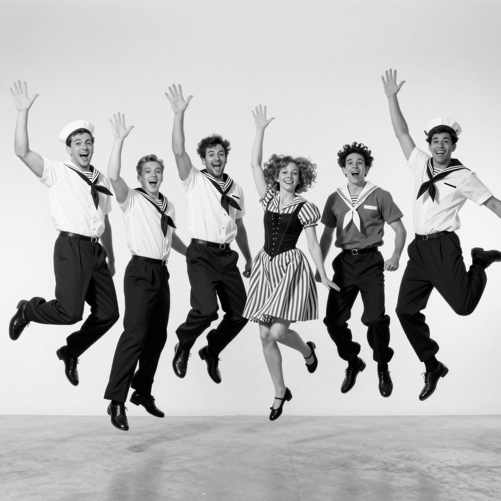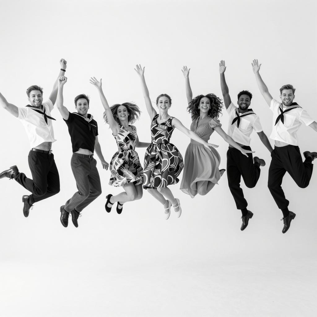 Black and white photograph of six people jumping in unison. They wear eclectic outfits: sailor uniforms, patterned dresses, and flowing skirts. Five men, one woman with curly hair. Smiling faces, arms outstretched, legs mid-air. White background.