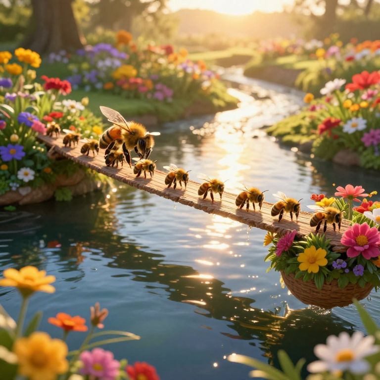 Giant honeybees traverse a shimmering bridge of sunlight, connecting vibrant floral islands suspended above a tranquil, mirror-like stream, as the golden glow of dawn reflects their industrious journey.