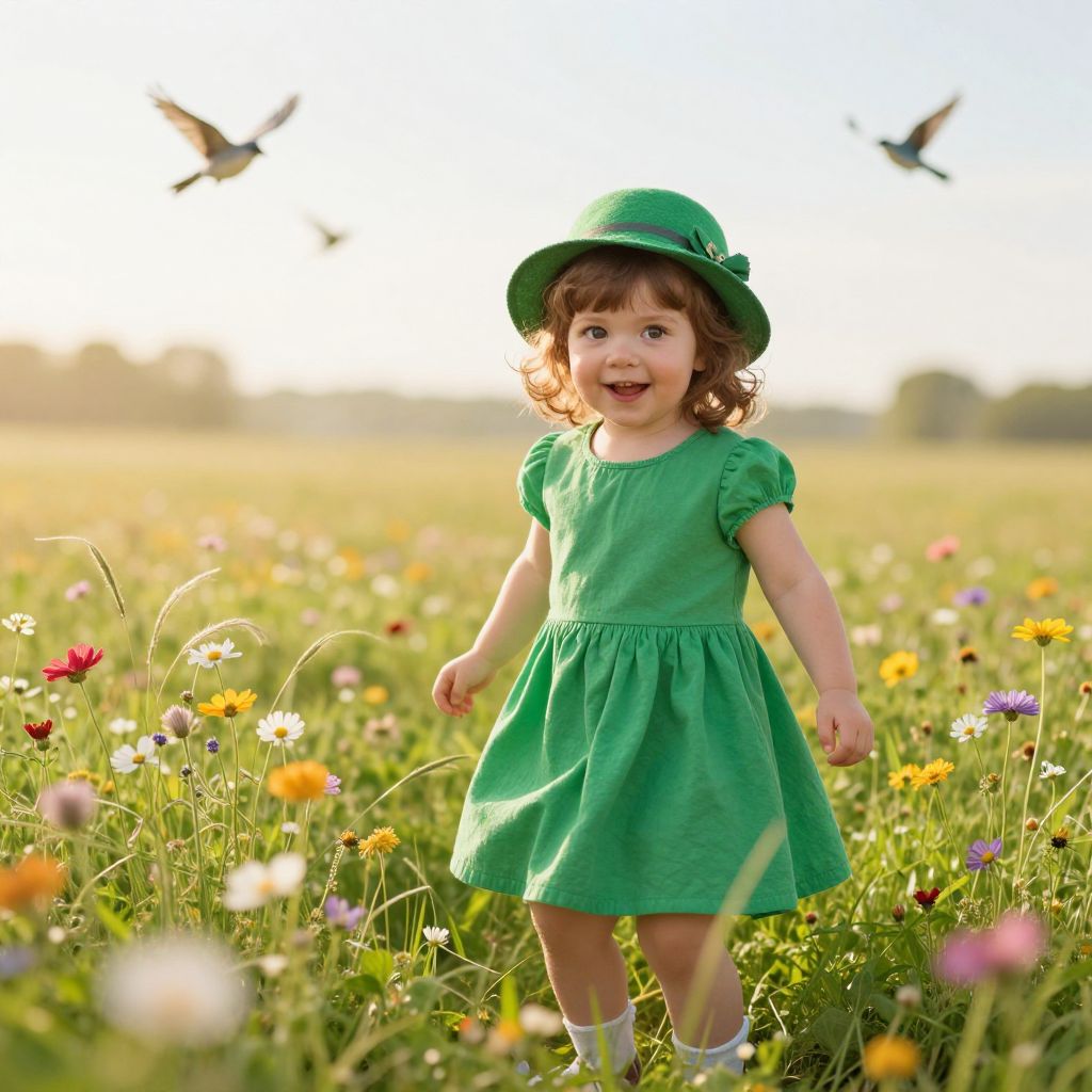 A young child with soft, curly brown hair and bright, curious eyes, wearing a vibrant green dress and a matching green hat with a tiny rosette, smiles playfully as she stands on a sunny grassy field filled with colorful wildflowers and soft green blades of grass. A gentle breeze stirs the grass and causes the flowers to sway slightly, while a few cheerful birds flutter through the sky in the background. The sunlight filters through the morning air, casting warm golden hues across the scene, creating a joyful, natural, and peaceful atmosphere that captures the innocence and wonder of childhood.