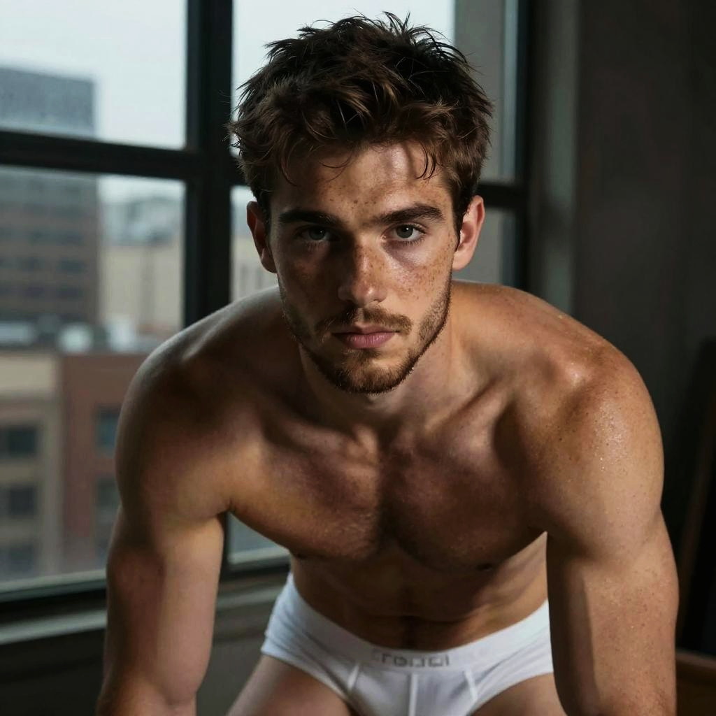 Close-up of a muscular, shirtless young man with tan glowing skin, freckles, scruffy beard, and messy hair leaning forward near a window. He wears white underwear and has a calm, intense expression, set against a dimly lit urban studio background with a city view.