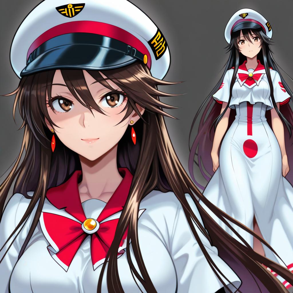 Akira ferrari, aria (manga), 1girl, brown eyes, hair between eyes, long hair, brown hair, very long hair, black hair, himeya company uniform, uniform, himeya company uniform, white dress, uniform, hat, earrings, by artist sido (slipknot), illustrious