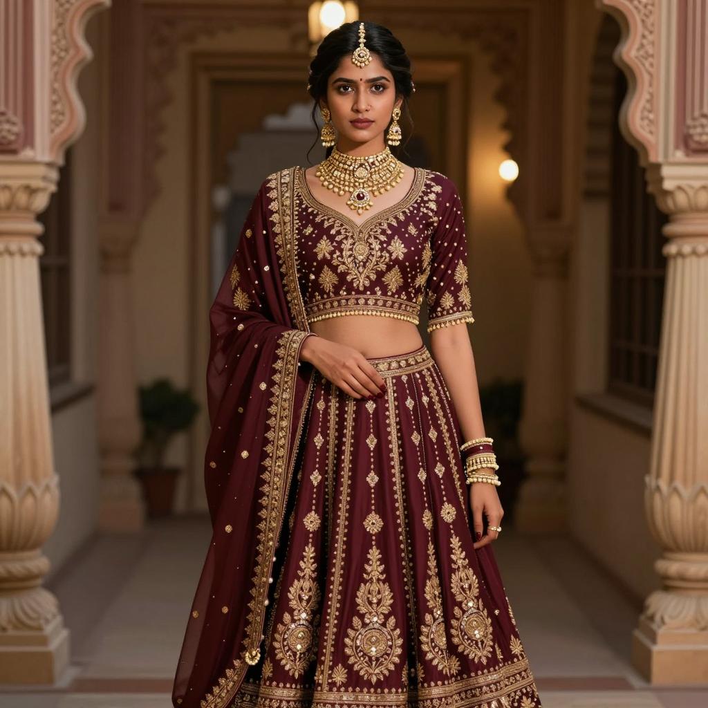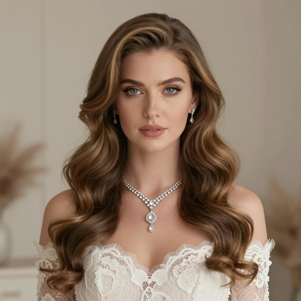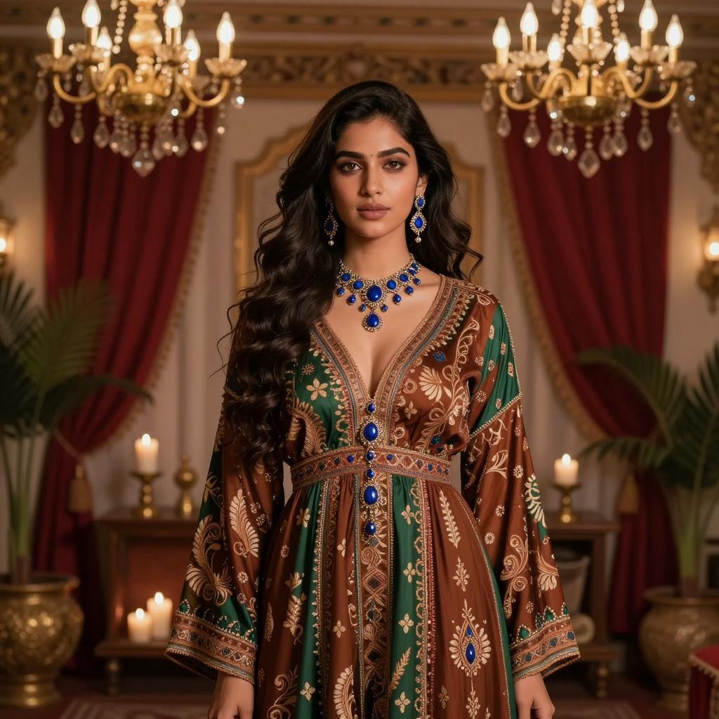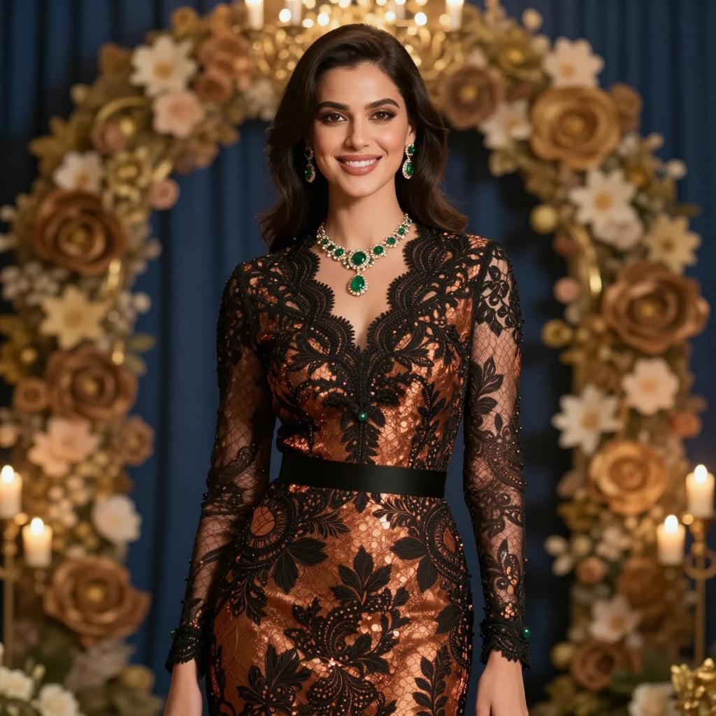 Gold party outfit, photorealistic portrait of a beautiful woman, wearing an ornate golden outfit with metallic ure, gold choker with detailed design, gold earrings, brown hair in a half-up style, light makeup with neutral colors, standing in a room with soft beige and white curtains, potted plant in the background, white swan statue to the left, warm and elegant lighting, realistic skin tone, looking slightly to the right, symmetrical composition, detailed facial features, elegant and regal atmosphere, 3/4 view.