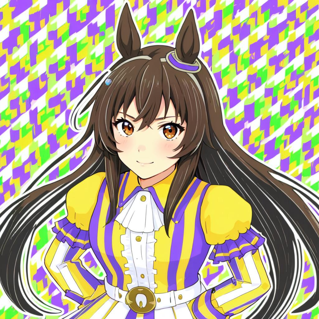 Anime-style illustration of a female character with horse ears and a horse tail. She has long black hair, yellow eyes, and is dressed in a colorful uniform featuring yellow, blue, and red accents with decorative ribbons. The background displays a pattern of vertical colorful stripes with geometric designs.