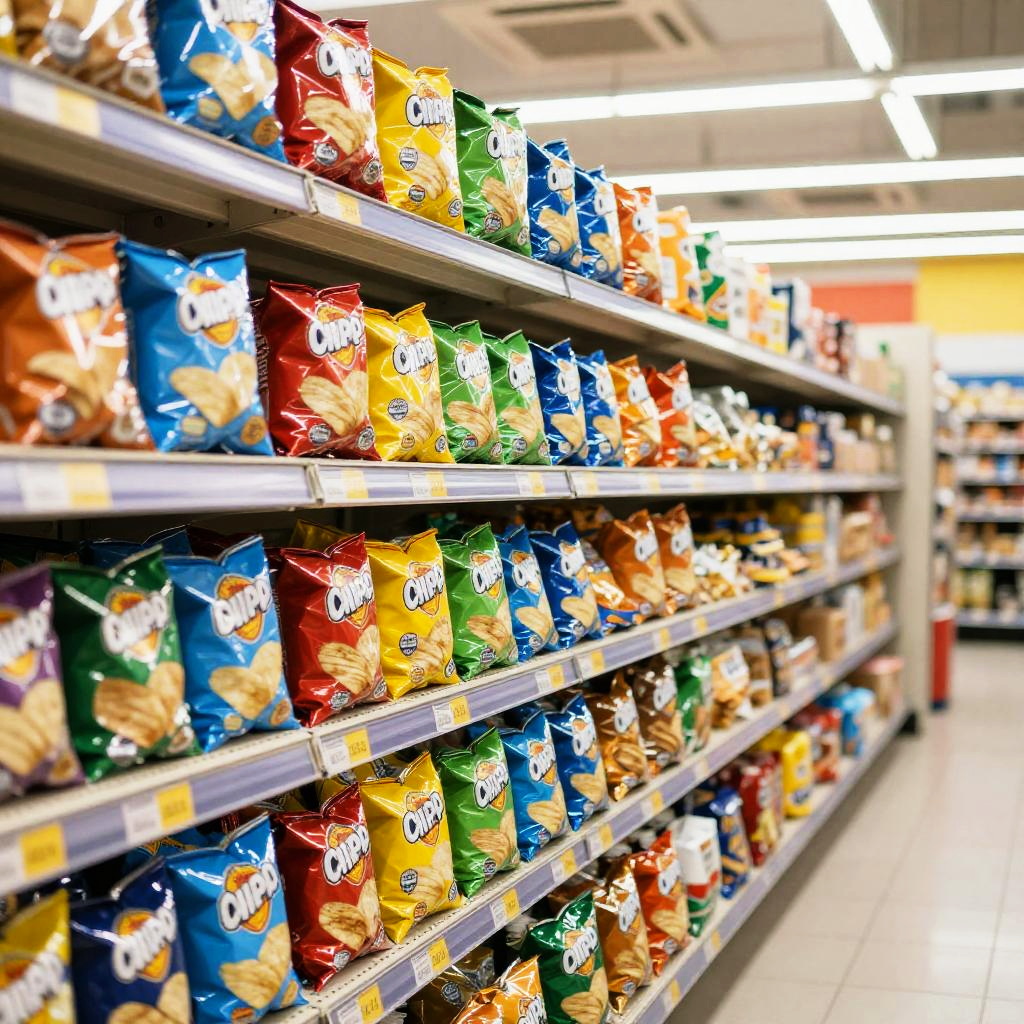 Chip bag size comparison panoramic view of chip bags of multiple sizes stacked neatly on shelves in a grocery store aisle, bright fluorescent lighting, lively atmosphere, retail display style