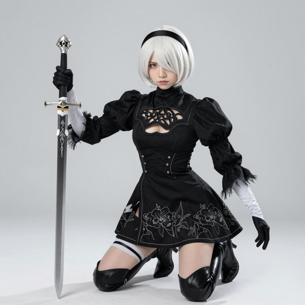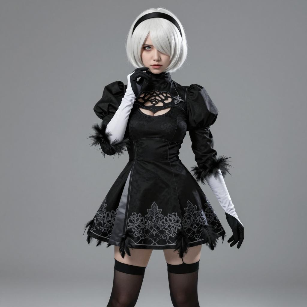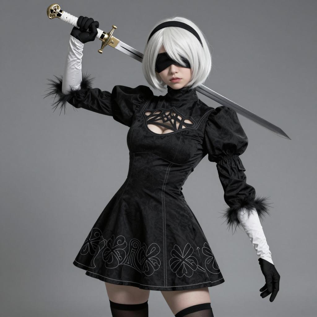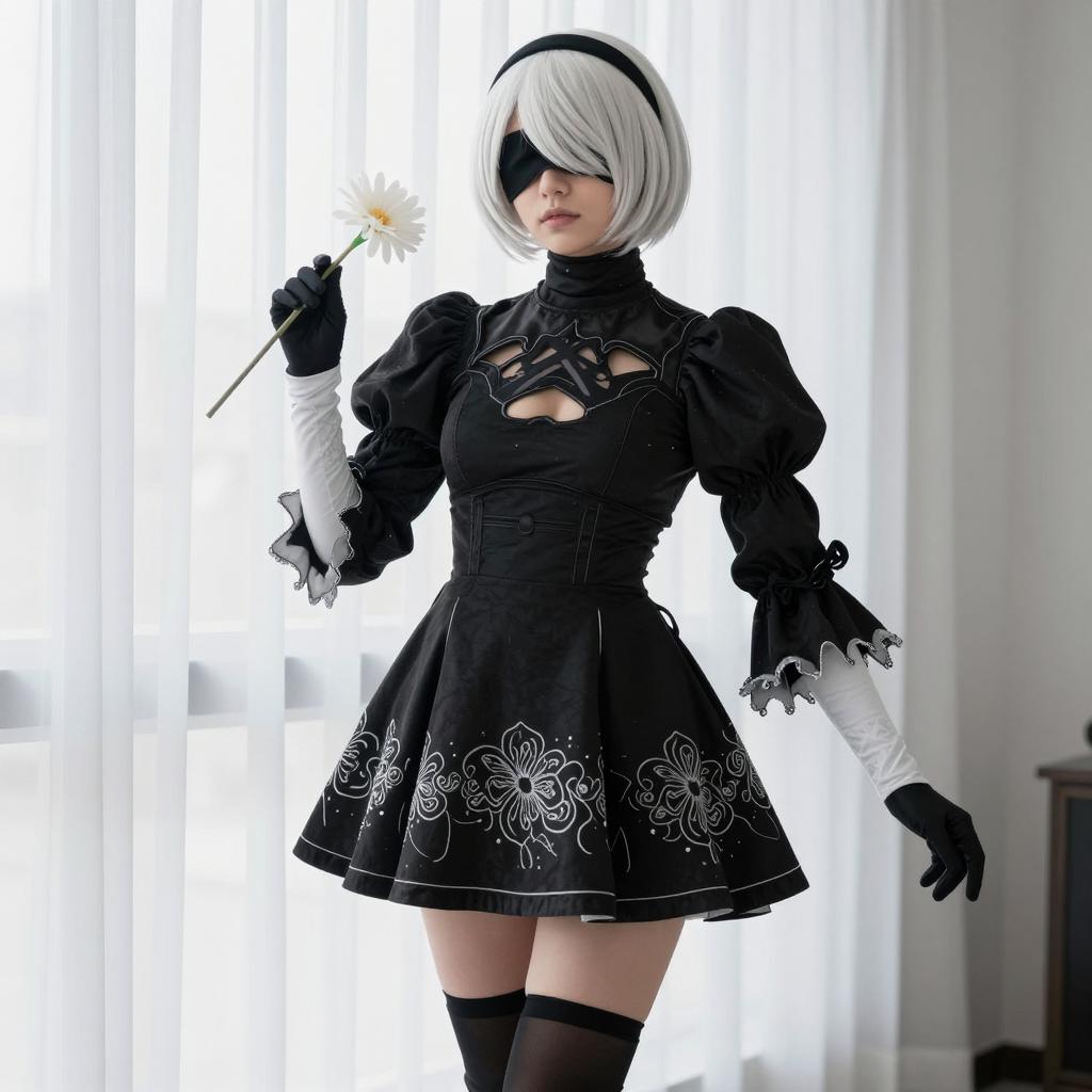 Two women in black gothic lolita dresses, holding red ribbons over their eyes. Left woman has short white hair, black hair bow, black stockings, black platform shoes. Right woman has long black hair, black hair bow, black lace-up knee socks, black platform shoes. Both have pale skin, black dresses with button details and puffed sleeves. Gray background.