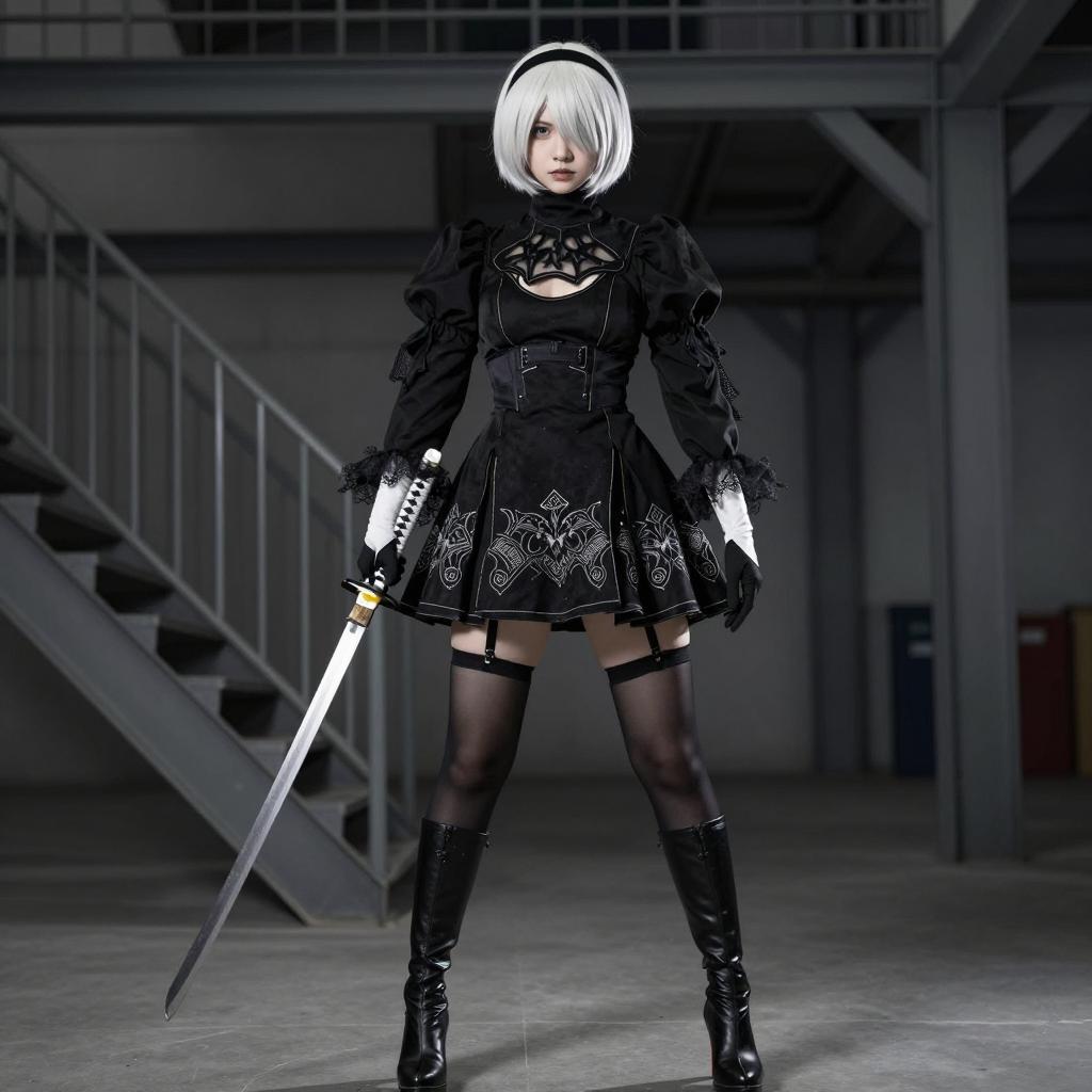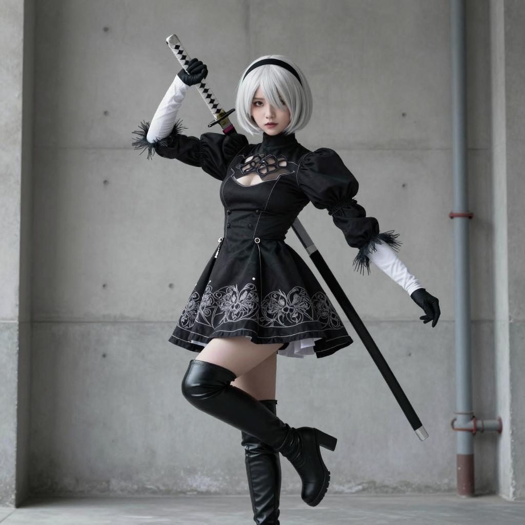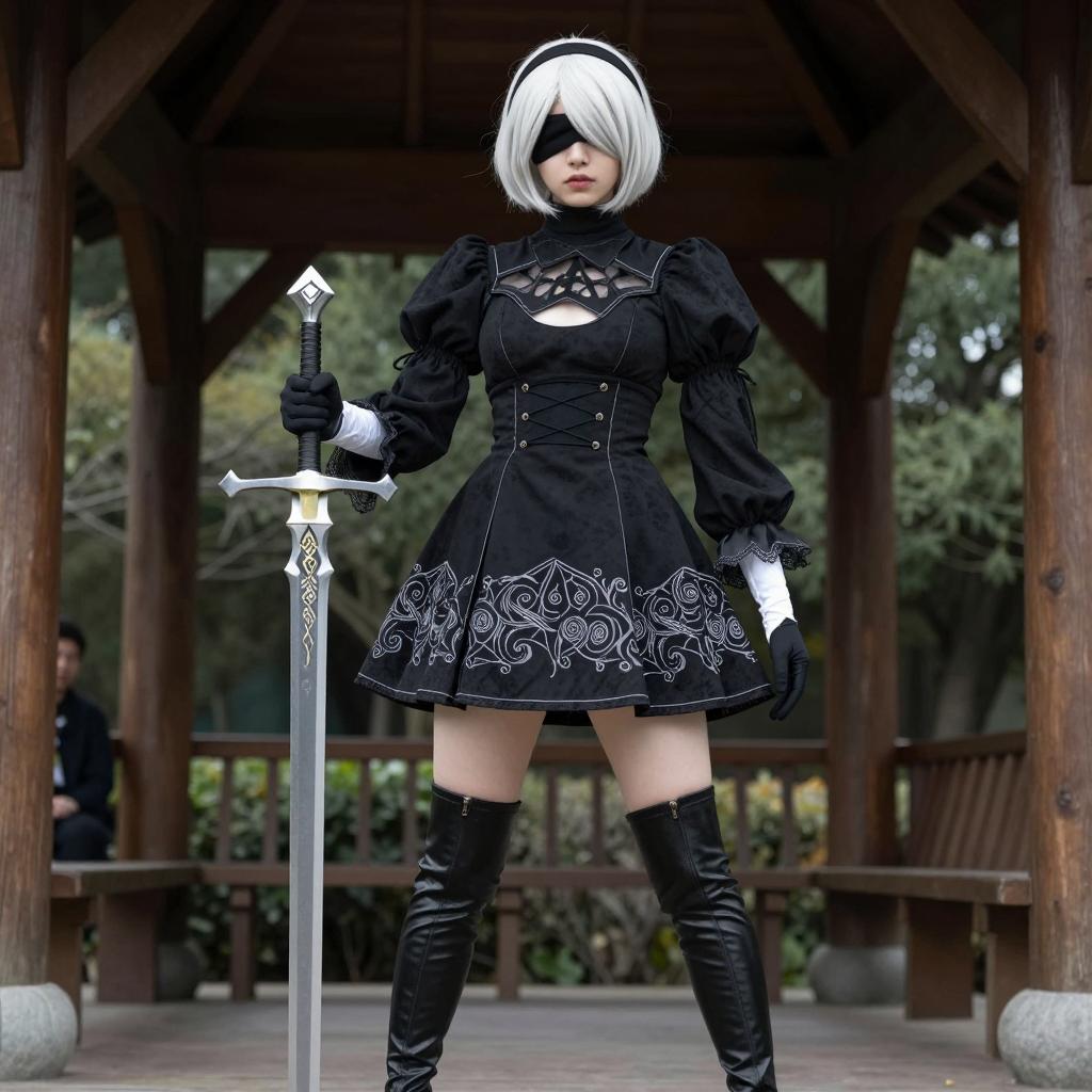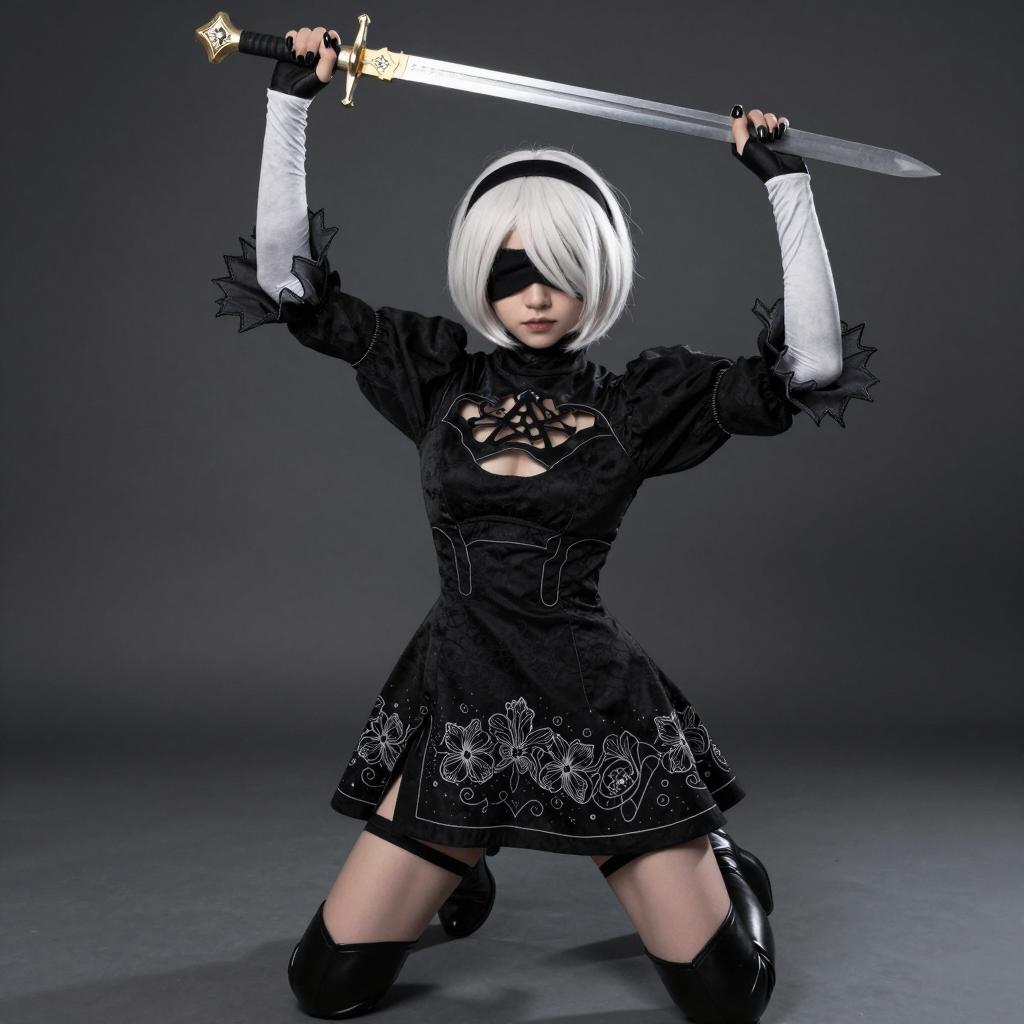 Two women in black gothic lolita dresses, holding red ribbons over their eyes. Left woman has short white hair, black hair bow, black stockings, black platform shoes. Right woman has long black hair, black hair bow, black lace-up knee socks, black platform shoes. Both have pale skin, black dresses with button details and puffed sleeves. Gray background.