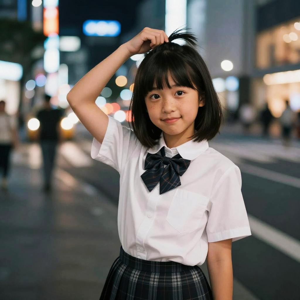 (school uniform:1.5), check pleats skirt, Tokyo street, night, cinematic lighting, light on face, cityscape, city lights, 1Japanese little girl, upper body, facial close-up, playful pose, (freckles), (short bob hair:1.5), blunt bangs, Put her hair up, smile, (8k, RAW photo, best quality, masterpiece:1.2), (realistic, photo-realistic:1.37), shot on CineStill 800T, (small chest), LoRA 1 Model: japanesedolllikeness_v10_lora_f16.ckpt, LoRA 1 Weight: 0.3, LoRA 2 Model: hipoly_3d_model_lora_f16.ckpt, LoRA 2 Weight: 0.1