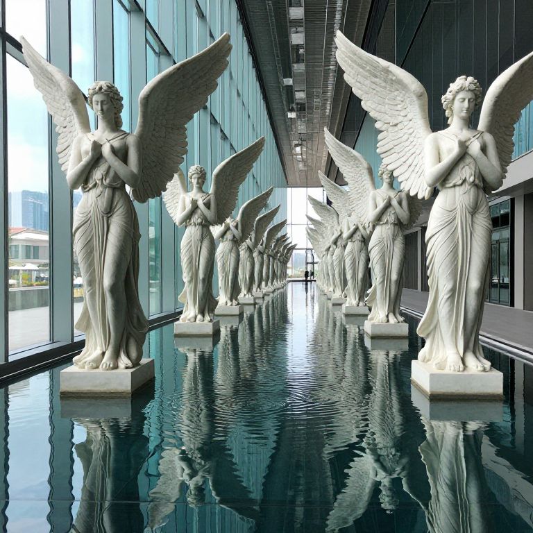 Photograph of a modern atrium with white marble winged statues of classical-style angels in flowing drapery, reflecting on a glossy, reflective floor