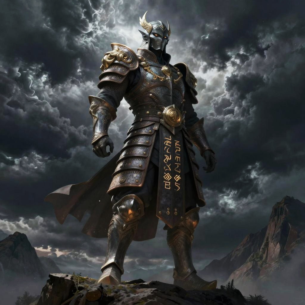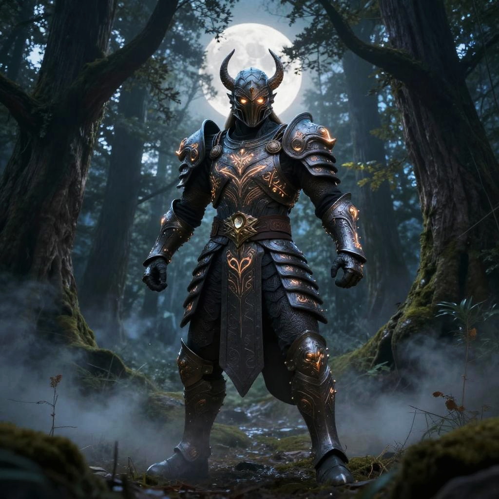 Mortal kombutt inspired warrior standing ready in a mystic forest at twilight, intricate armor with glowing runes, powerful stance, mist swirling around ancient trees, moonlight casting eerie highlights, atmospheric and cinematic composition