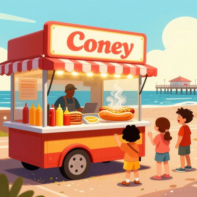 Coney hot dog stand, a retro food cart with steaming hot dogs, mustard and ketchup bottles, excited kids waiting in line, the seaside pier in the background, illustration style with warm colors and a festive mood.