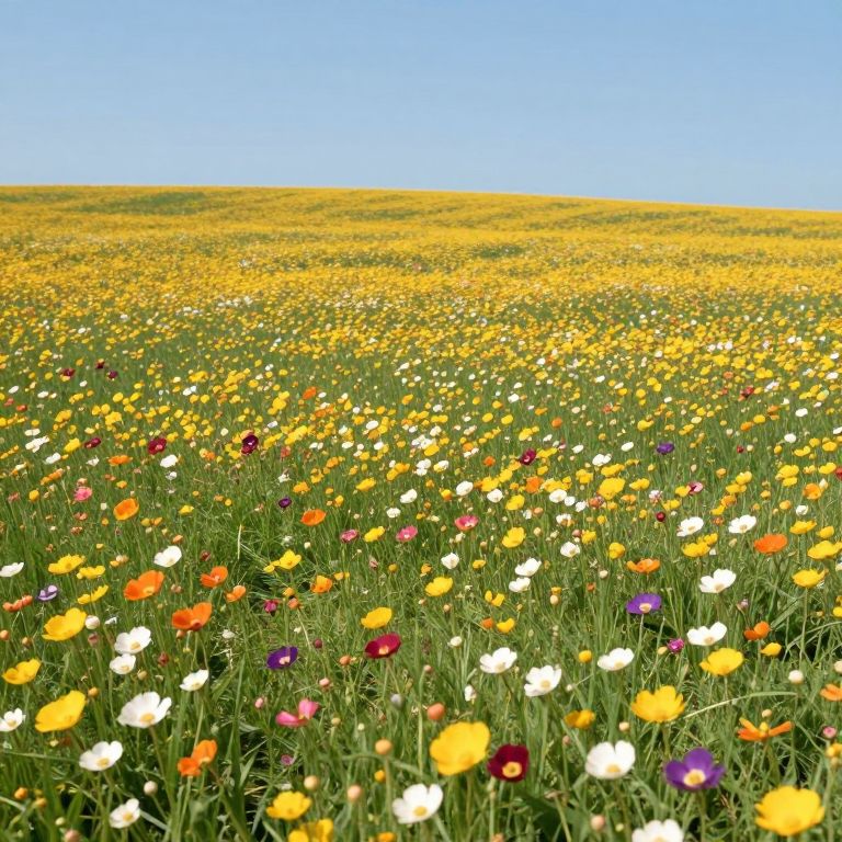 Vibrant photograph of a vast field filled with colorful wildflowers, including yellow, white, orange, and purple blooms under a clear blue sky.