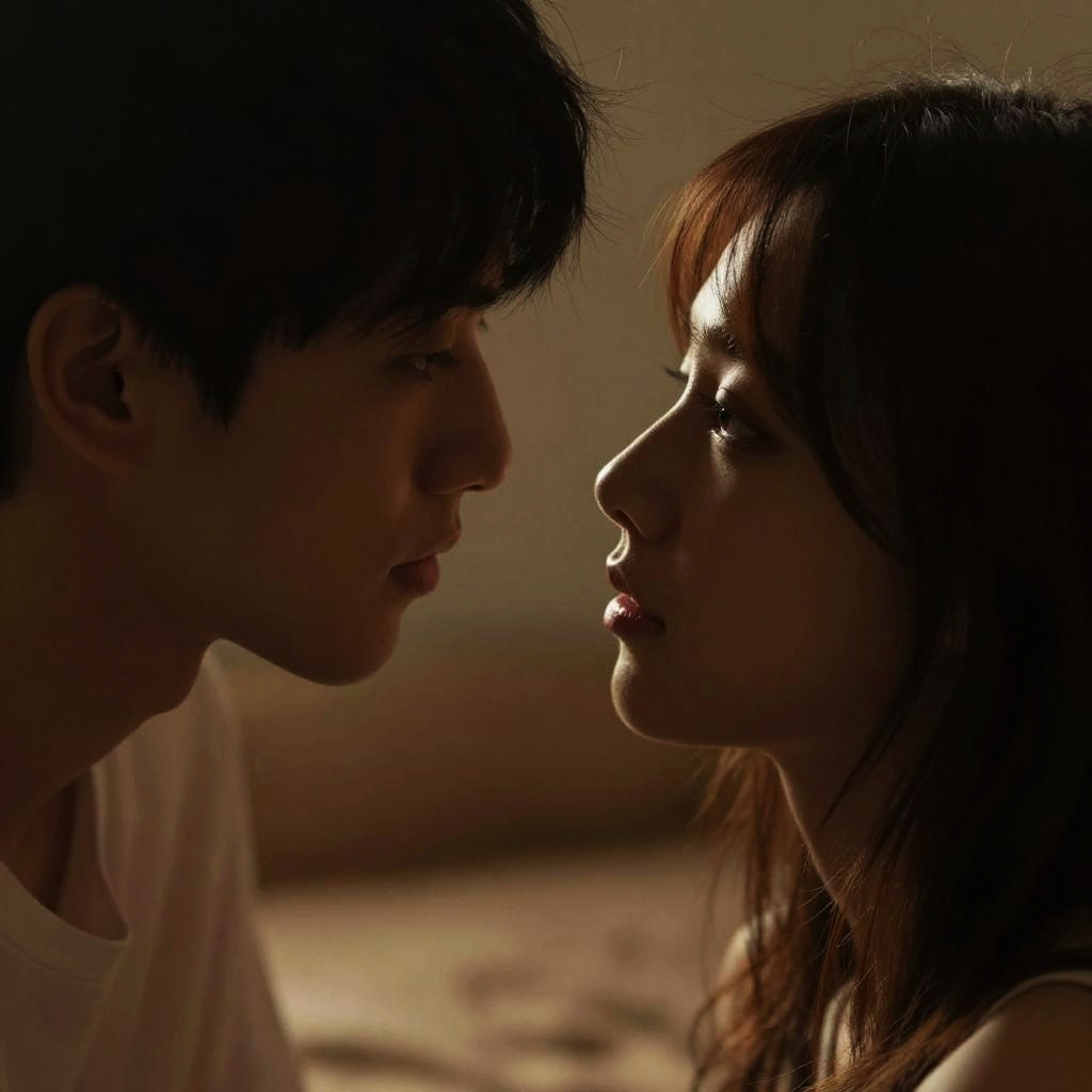 Sensual eye contact between two people in a dimly lit room, warm tones, soft focus, intimate close-up, capturing the deep emotional connection and subtle expressions.