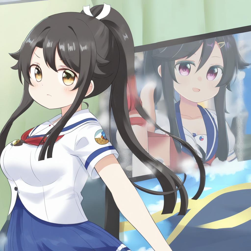 This digital anime-style illustration features a young girl with long, black hair in a high ponytail and large, expressive yellow eyes, wearing a white sailor-style school uniform with a blue skirt and red necktie. She stands in the foreground, turned slightly to the left, with a confident expression. In the background, a reflection shows the same girl, slightly blurred, with pink eyes. The background has a green gradient and a partially visible blue and yellow flag. The image is bright and colorful, with soft shading and a clean, polished look. The artist's signature is visible on the right side.