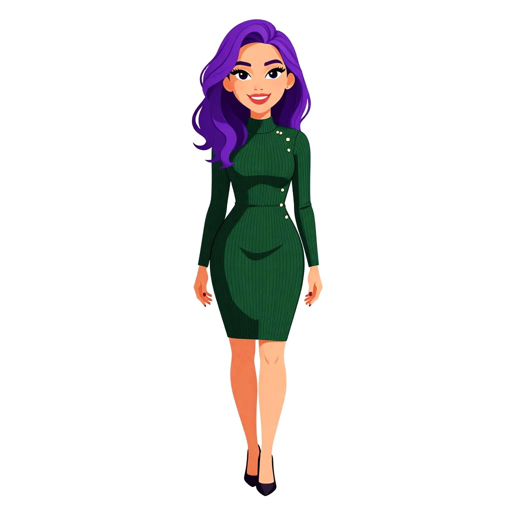 Digital drawing of a confident woman with purple bob haircut, wearing a bright yellow double-breasted suit with black buttons, black high heels, and a smile